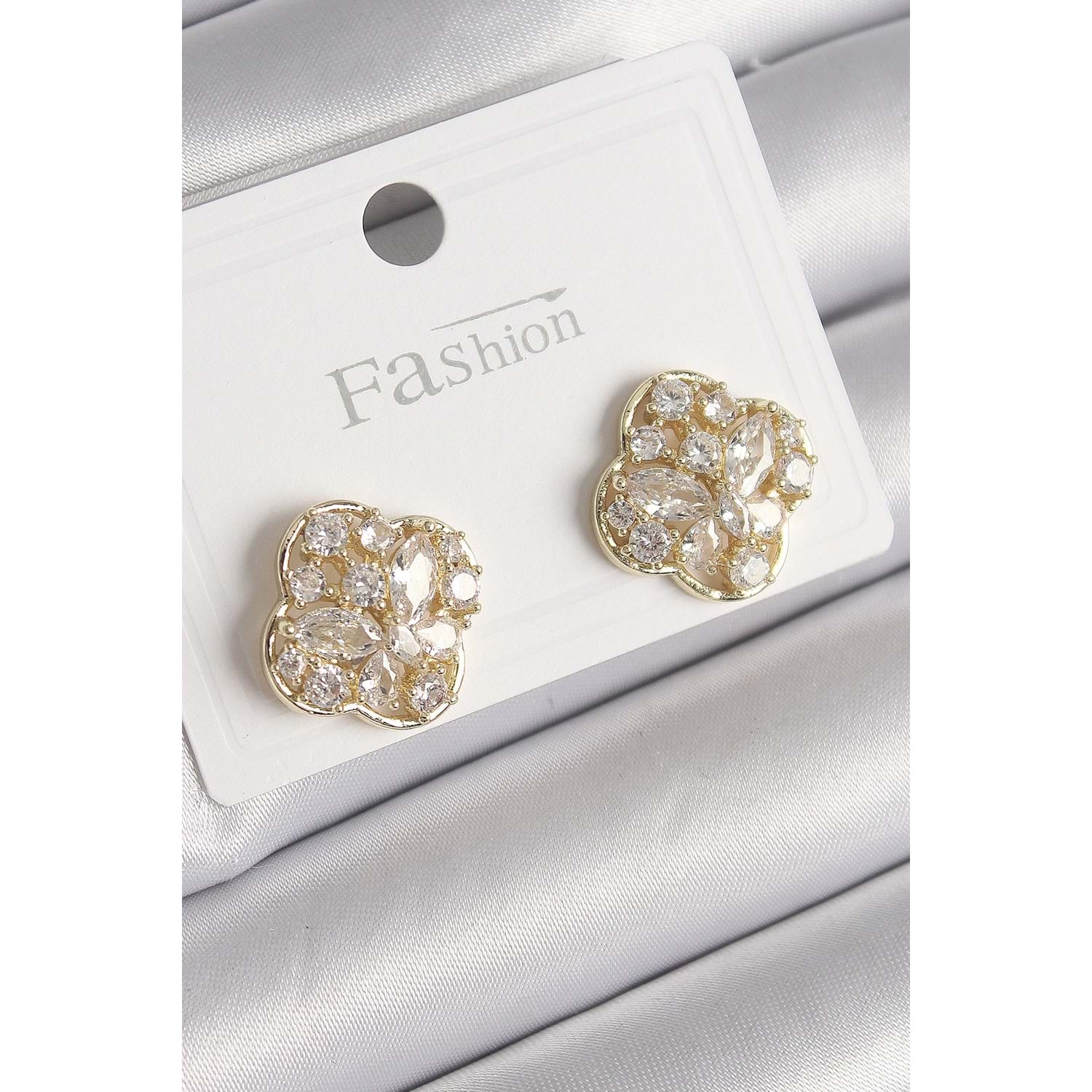 Pirinç Gold Renk Zirkon Taşlı Yonca Model Kadın Küpe
