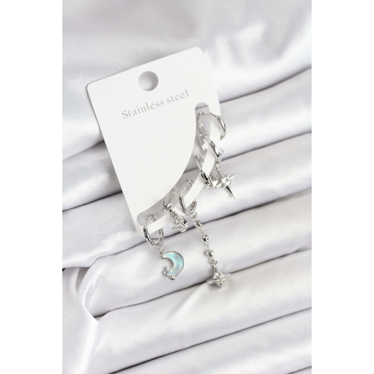 Pirinç Gümüş Renk Ay Model Kadın Set Küpe