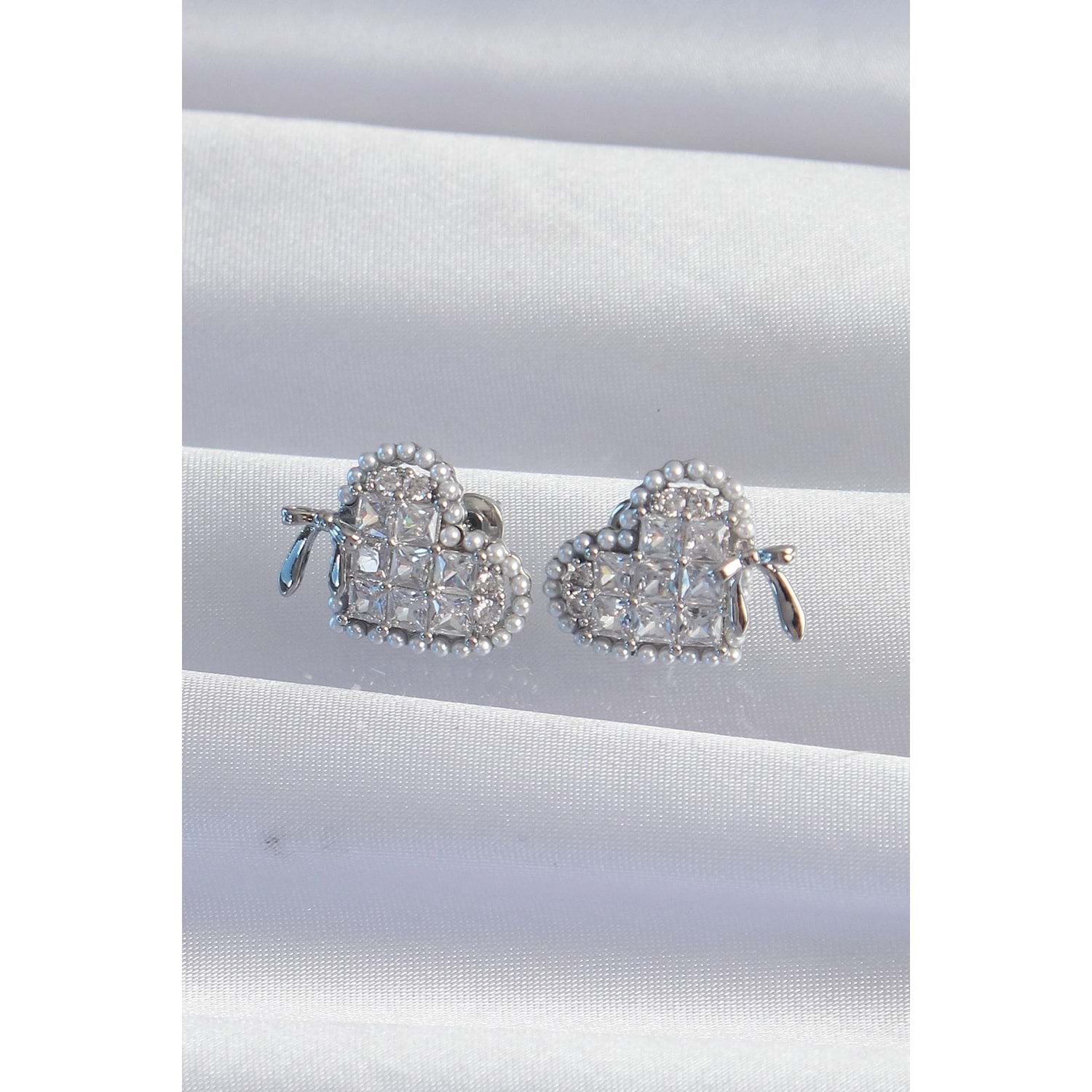 Pirinç Gümüş Renk Fiyonk Detay İncili Zirkon Taşlı Kalp Küpe