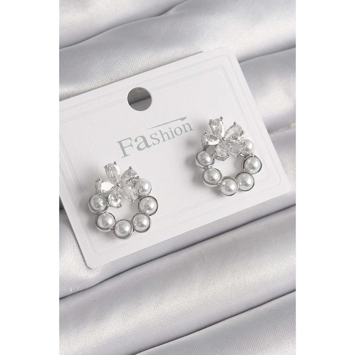 Pirinç Gümüş Renk İncili Halka Model Zirkon Taşlı Çiçek Detay Kadın Küpe