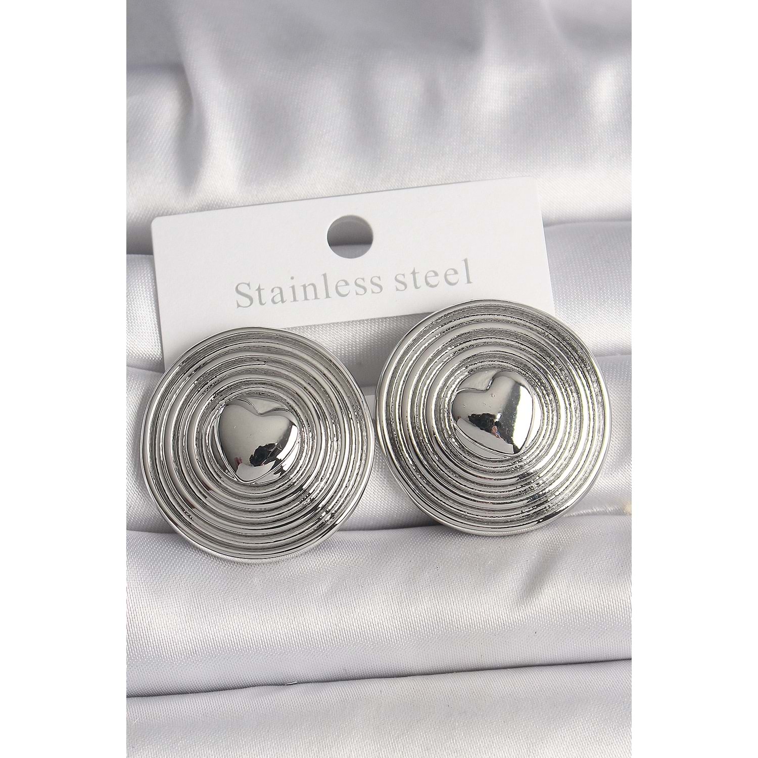 Pirinç Gümüş Renk Kalp İşlemeli Daire Plaka Model Kadın Küpe