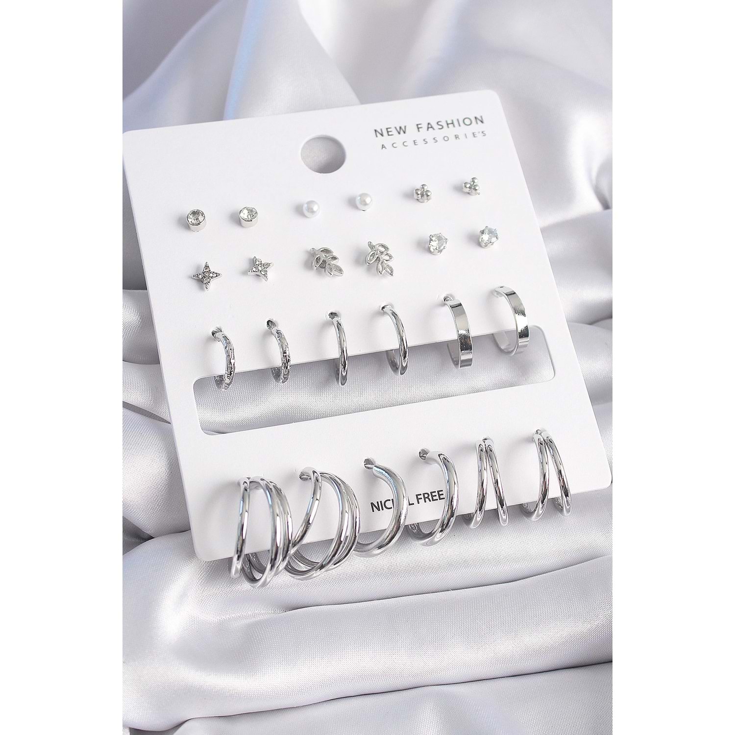 Pirinç Gümüş Renk Zirkon Taşlı 12 Çift Küpe Seti