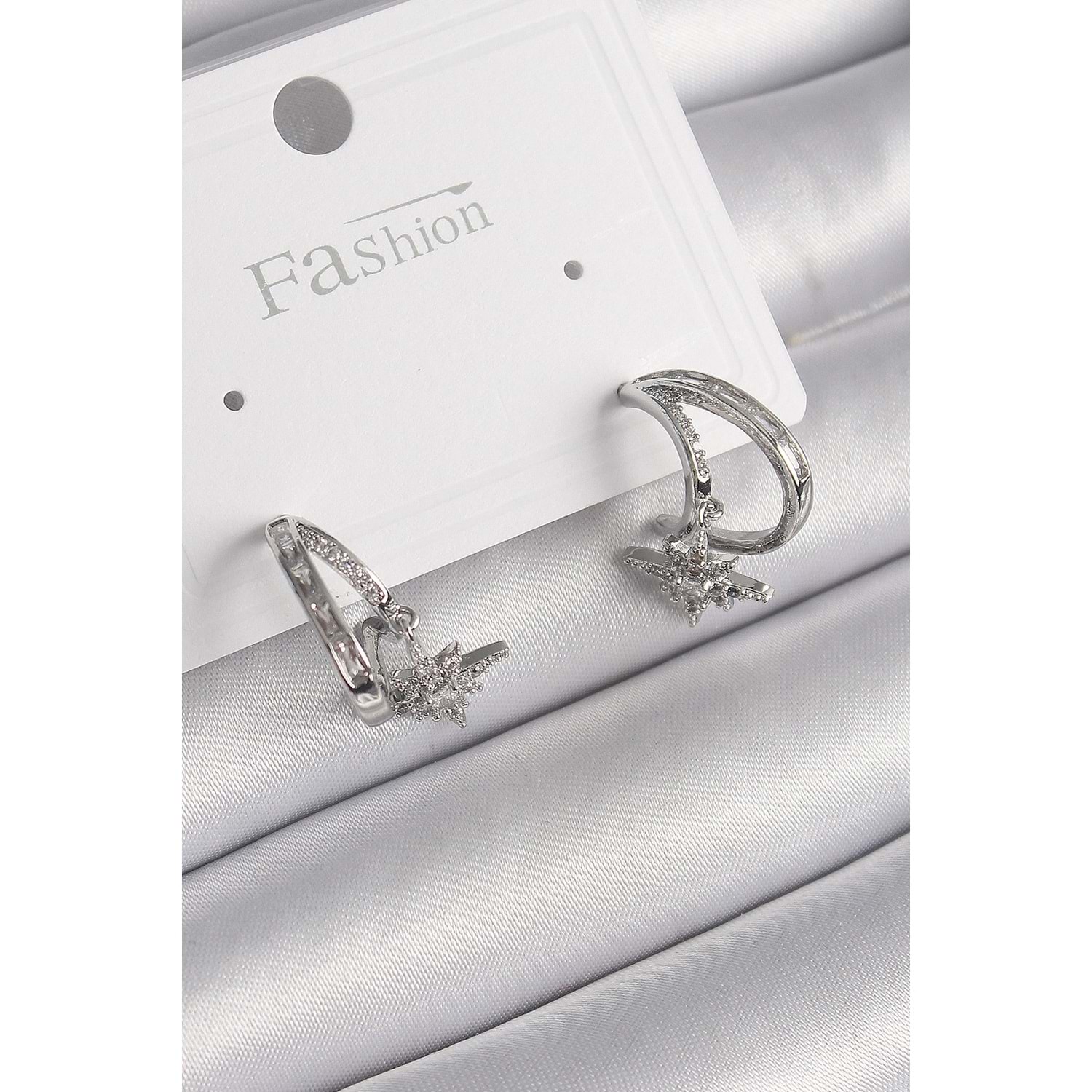 Pirinç Gümüş Renk Zirkon Taşlı Halka Model Sallantı Yıldız Detay Kadın Küpe