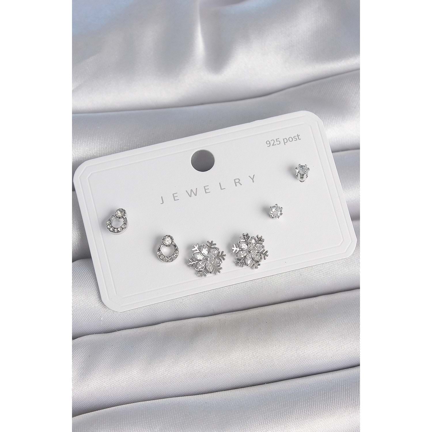 Pirinç Gümüş Renk Zirkon Taşlı Kar Tanesi Model 925 Ayar Gümüş Çivi Kadın Küpe Seti