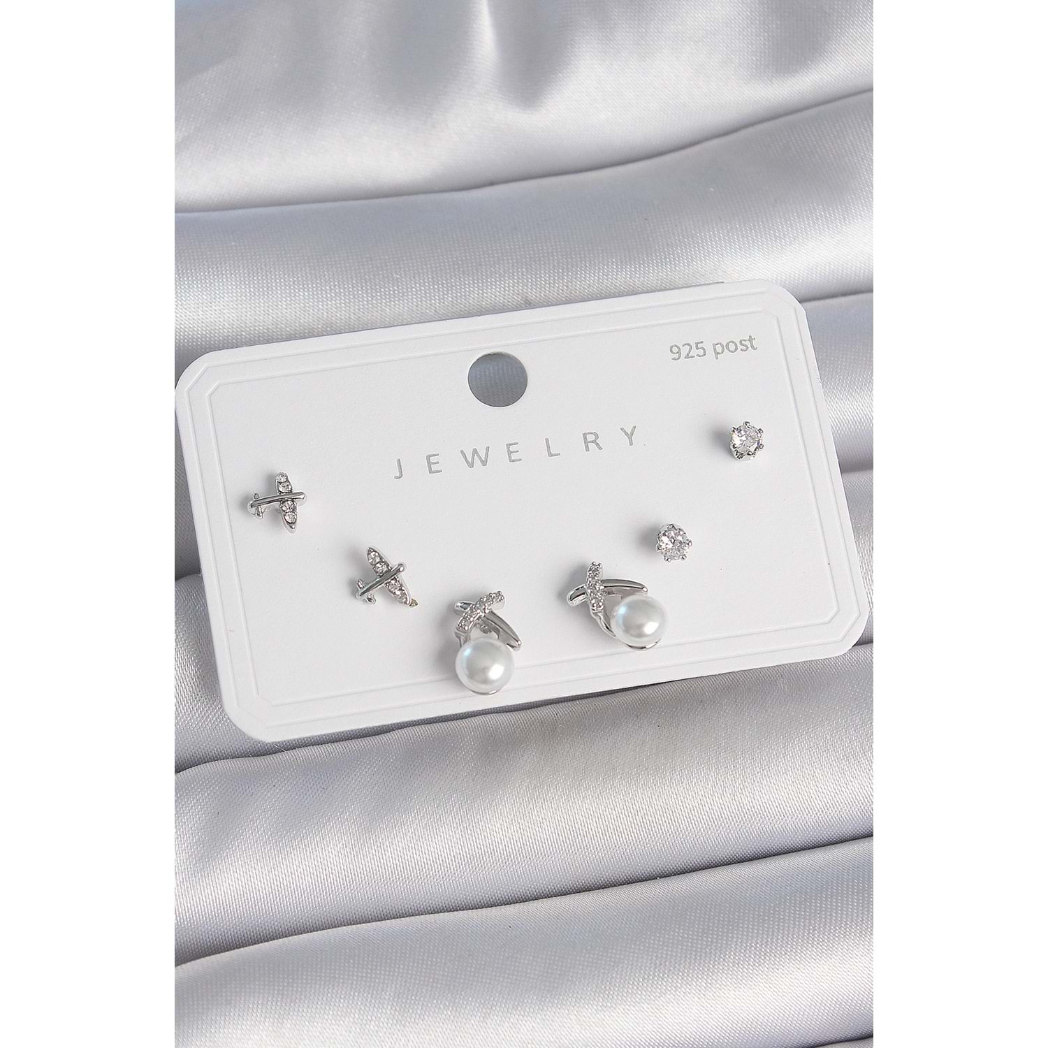 Pirinç Gümüş Renk Zirkon Taşlı Kelebek Model İnci Detay 925 Ayar Gümüş Çivi Kadın Küpe Seti