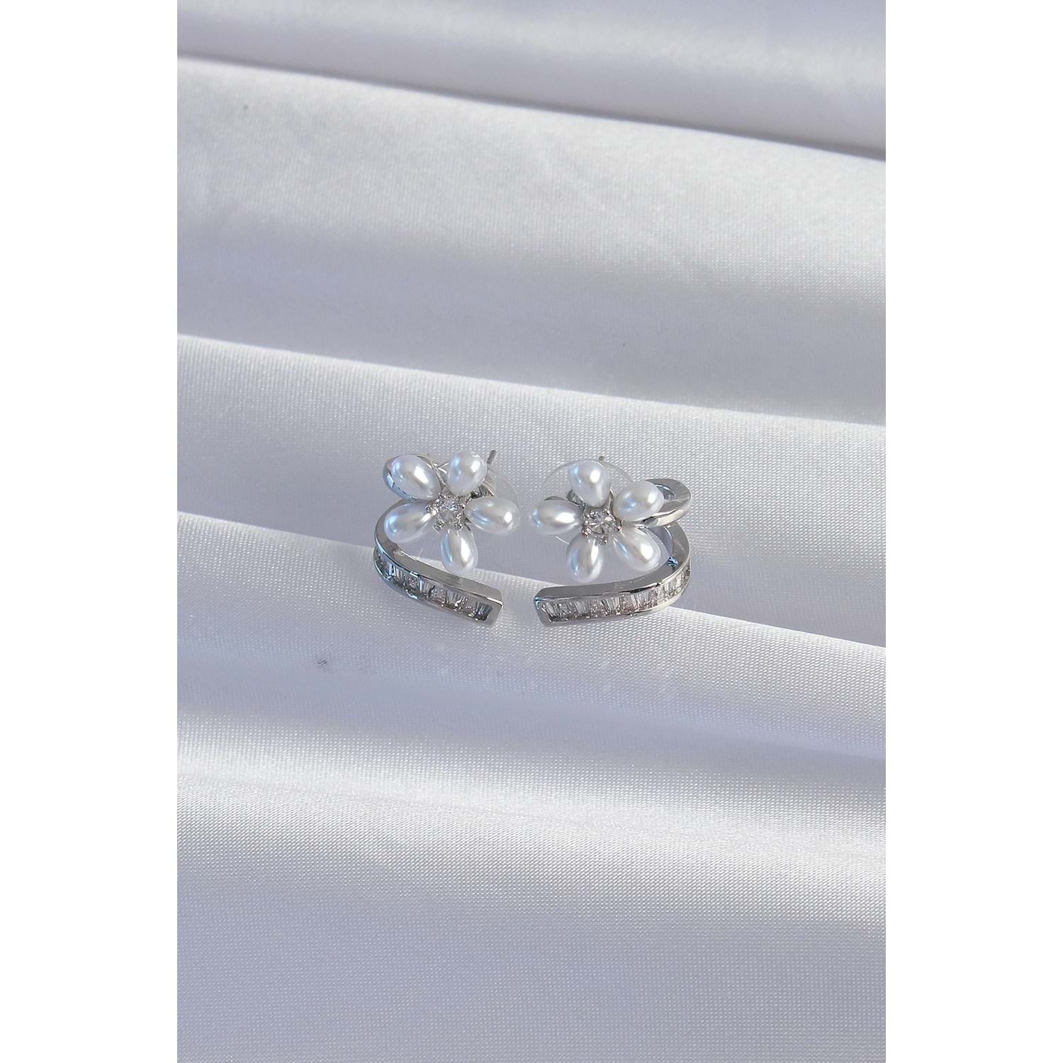 Pirinç Gümüş Renk Zirkon Taşlı Kıvrımlı İnci Çiçek Küpe