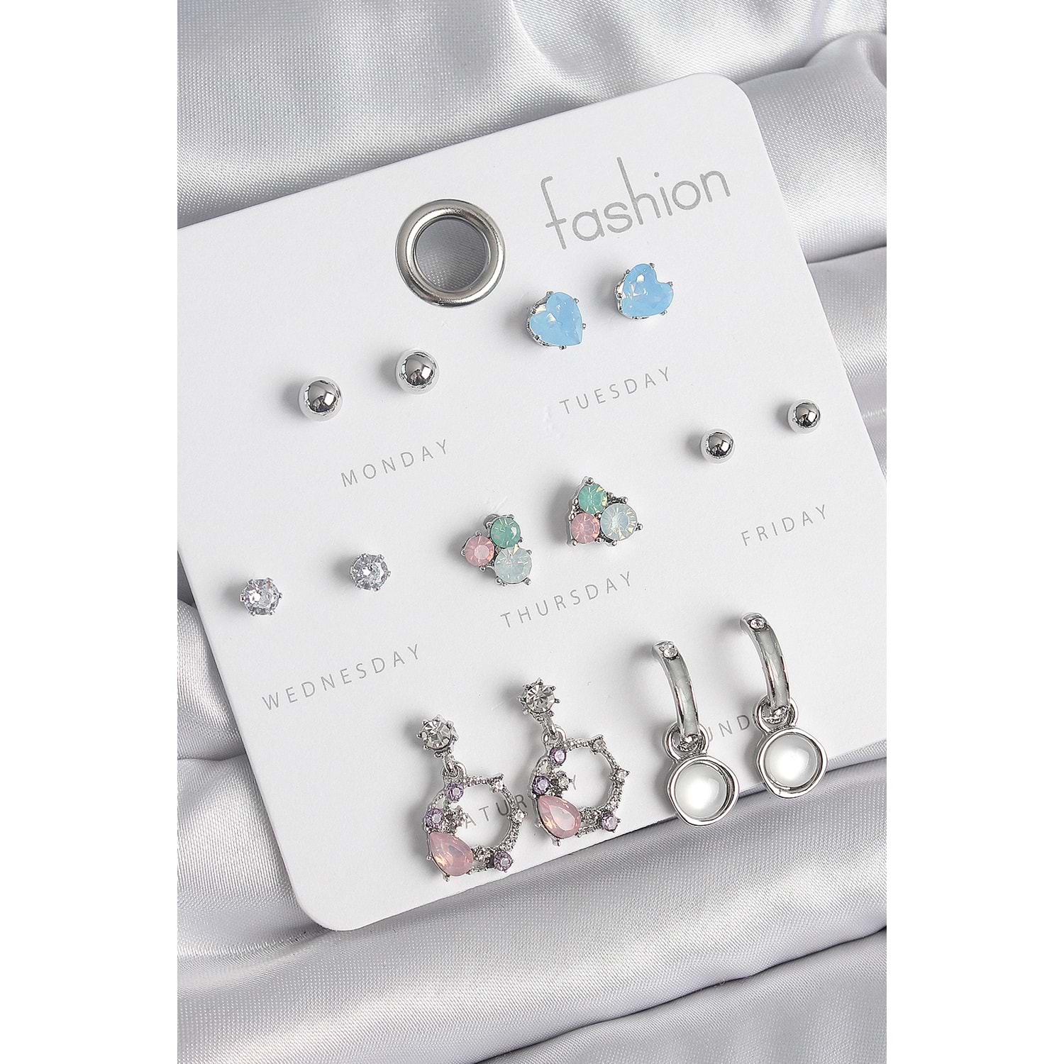 Pirinç Gümüş Renk Zirkon Taşlı Sallantı Halka Model Çiçek Detay 7 Çift Kadın Küpe Seti