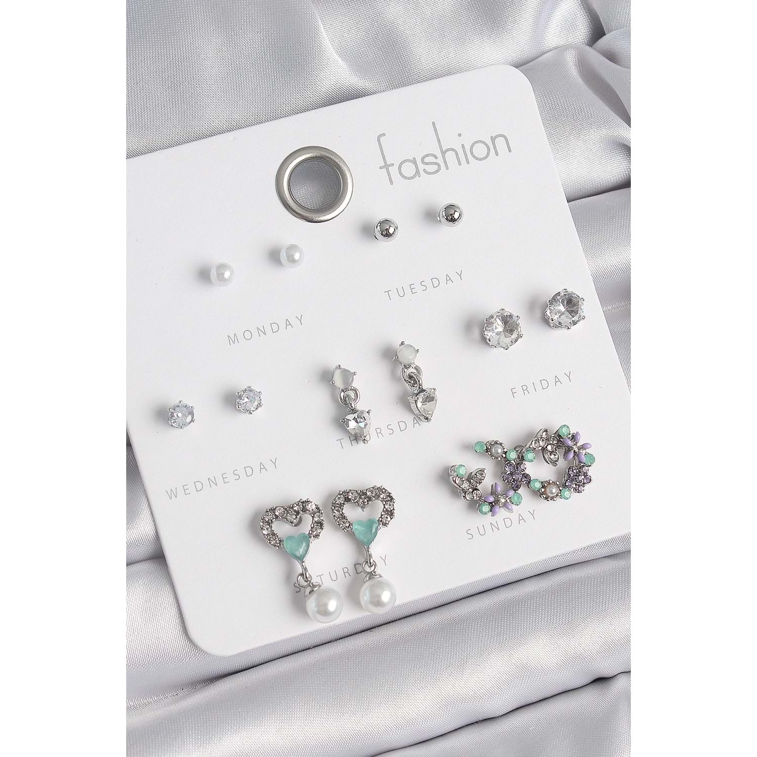 Pirinç Gümüş Renk Zirkon Taşlı Sallantılı Kalp Model Çiçek Detay 7 Çift Kadın Küpe Seti