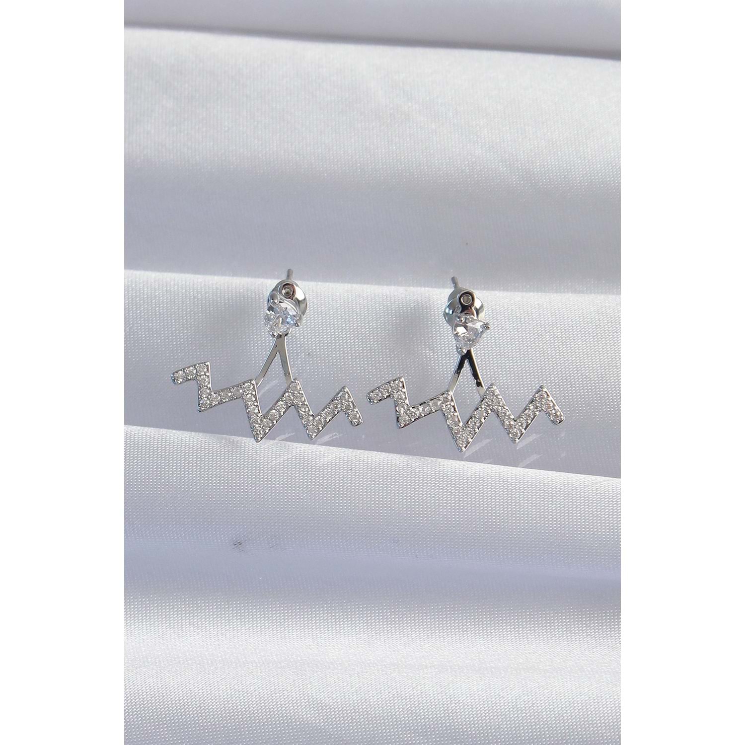 Pirinç Gümüş Renk Zirkon Taşlı Zikzak Küpe