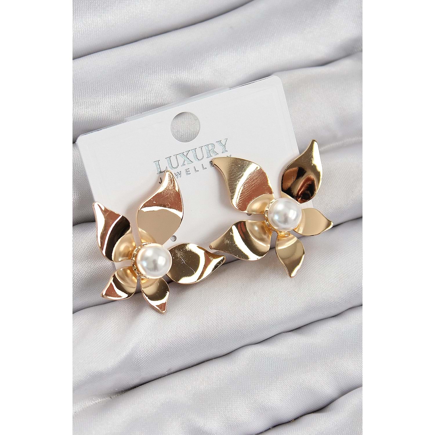 Pirinç İnci Detaylı Çiçek Model Gold Renk Kadın Küpe