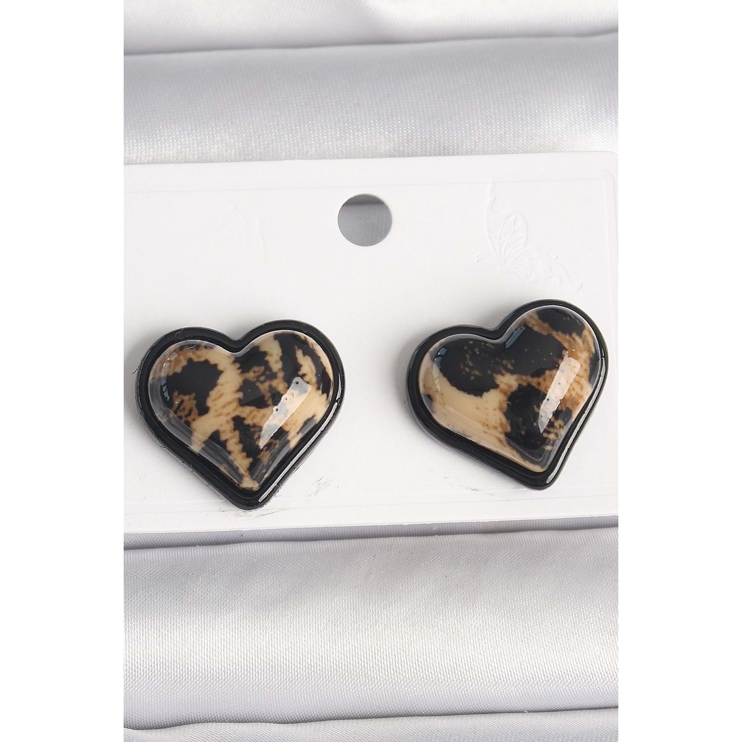 Pirinç Siyah Renk Leopar Desen 3D Kalp Model Kadın Küpe