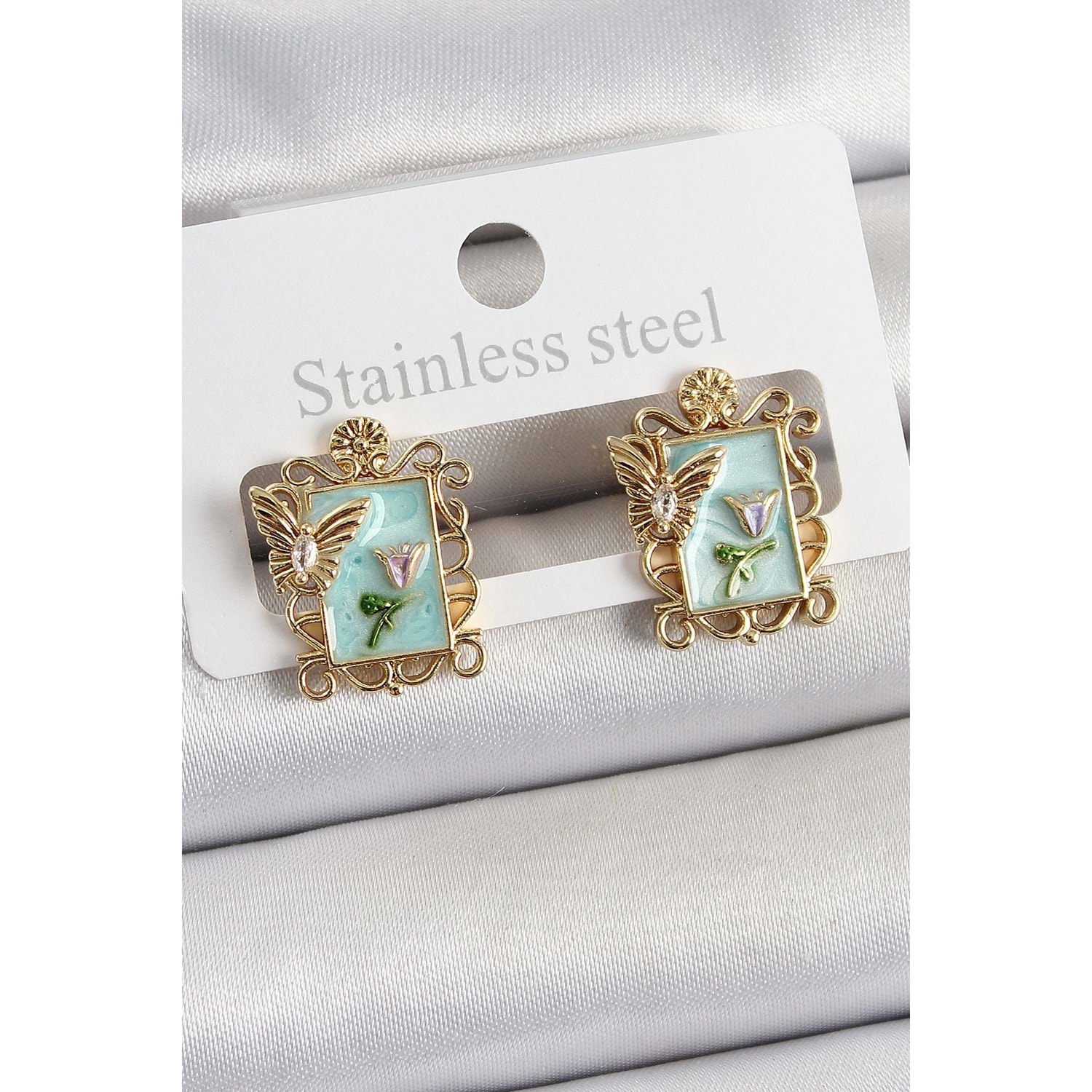 Pirinç Yeşil Mineli Sanatsal Portre Model Gold Renk Kadın Küpe