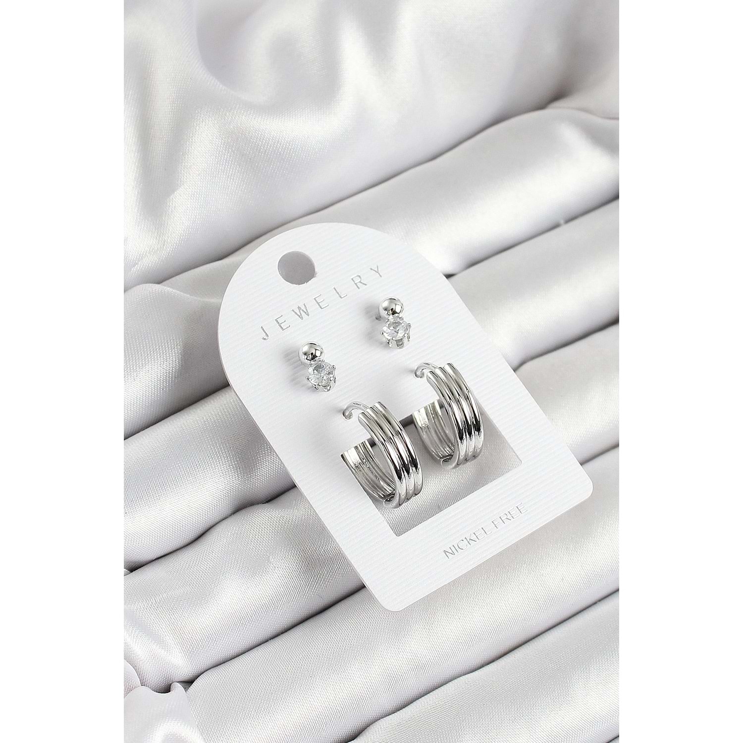 Pirinç Zirkon Taş Ve Halka Figürlü Gümüş Renk 3'lü Çift Kadın Küpe Set