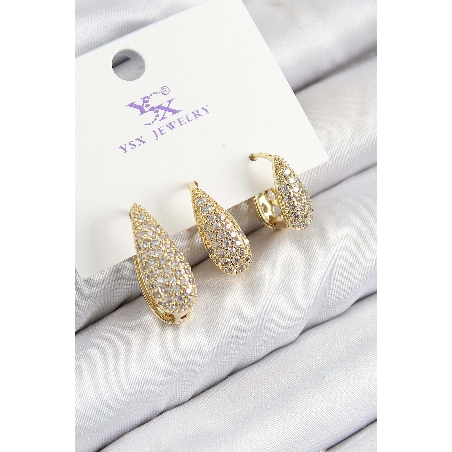 Pirinç Zirkon Taşlı 3'lü Damla Model Gold Renk Kadın Küpe