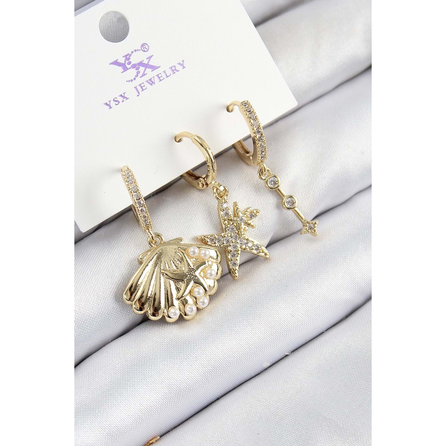 Pirinç Zirkon Taşlı 3'lü İstiridye Ve Yıldız Model Gold Renk Kadın Küpe