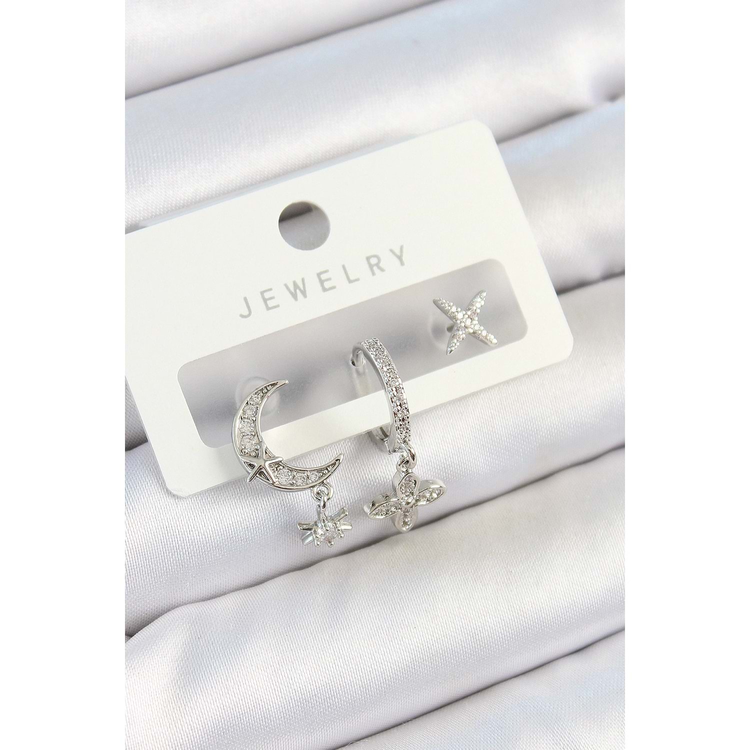 Pirinç Zirkon Taşlı Çiçek Ve Ay Model Gümüş Renk 3'lü Çift Kadın Küpe Set