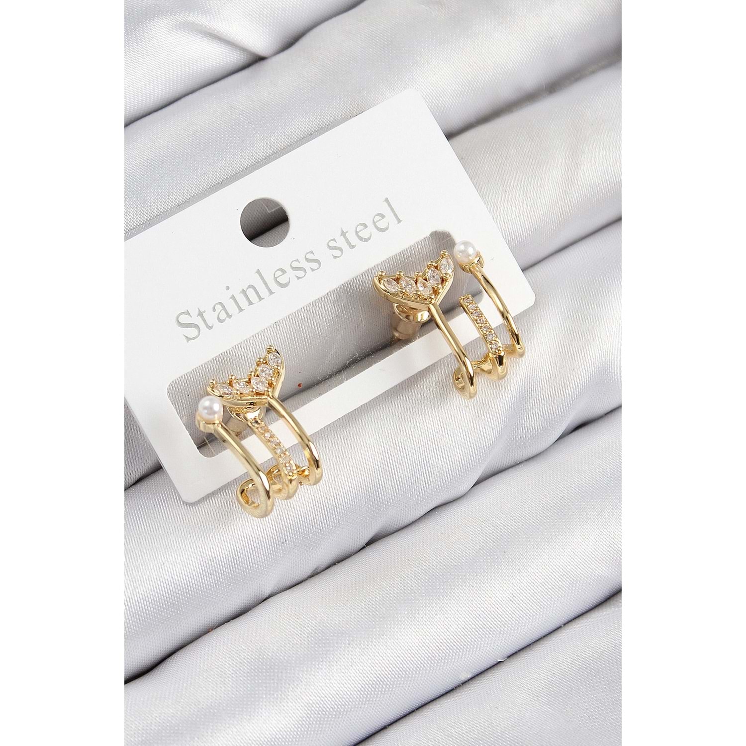 Pirinç Zirkon Taşlı İnci Detaylı Balık Kuyruğu Model Gold Renk Kadın Küpe
