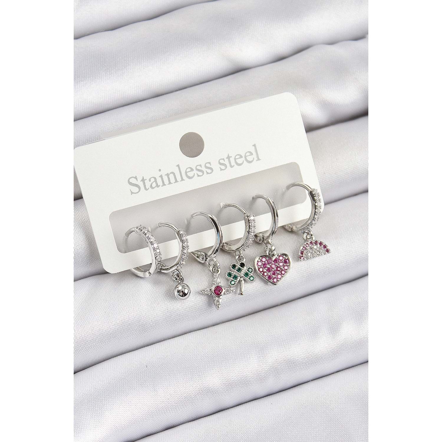 Pirinç Zirkon Taşlı Karpuz Yonca Kalp Pusula Karışık Model Gümüş Renk 6'lı Set Kadın Küpe