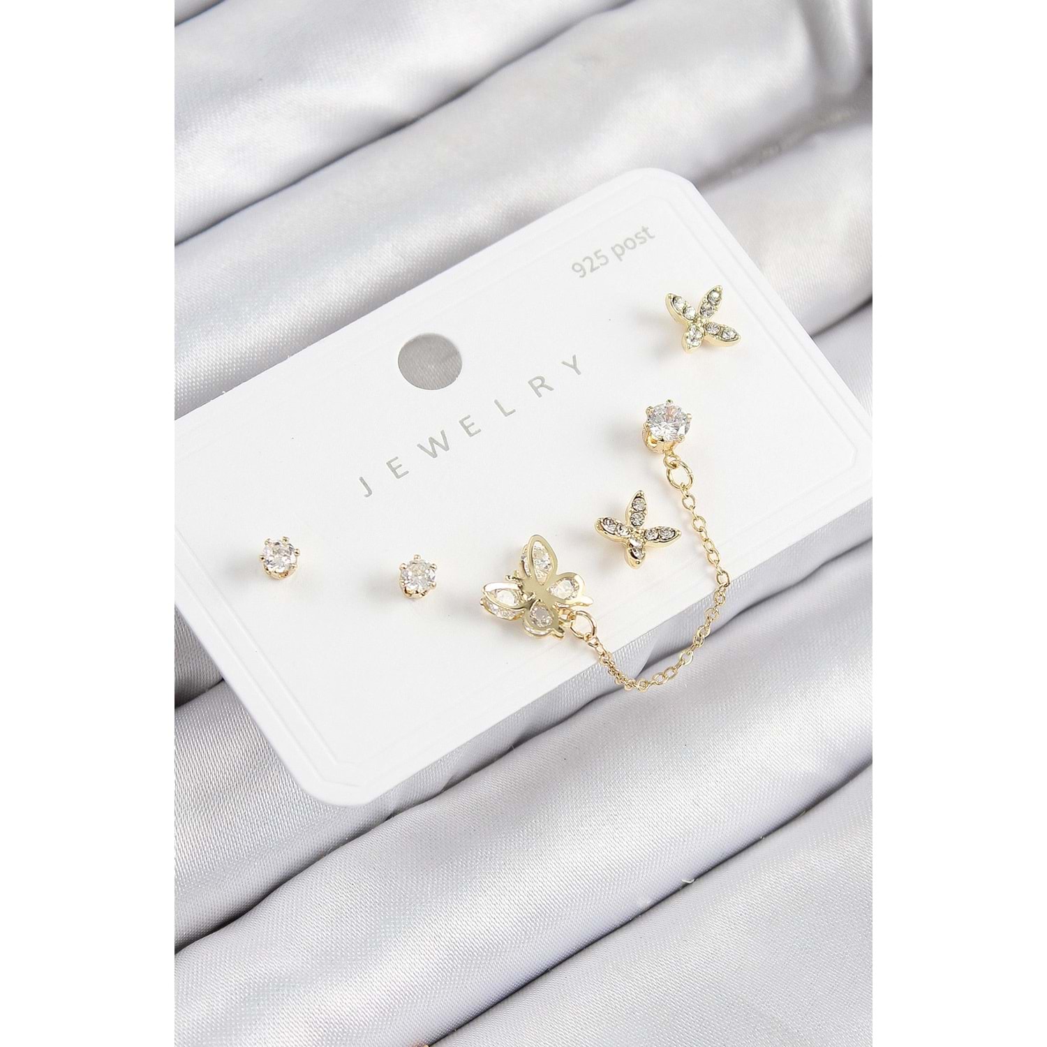 Pirinç Zirkon Taşlı Kelebek Model Gold Renk 925 Ayar Gümüş Çivi Kadın Küpe Set