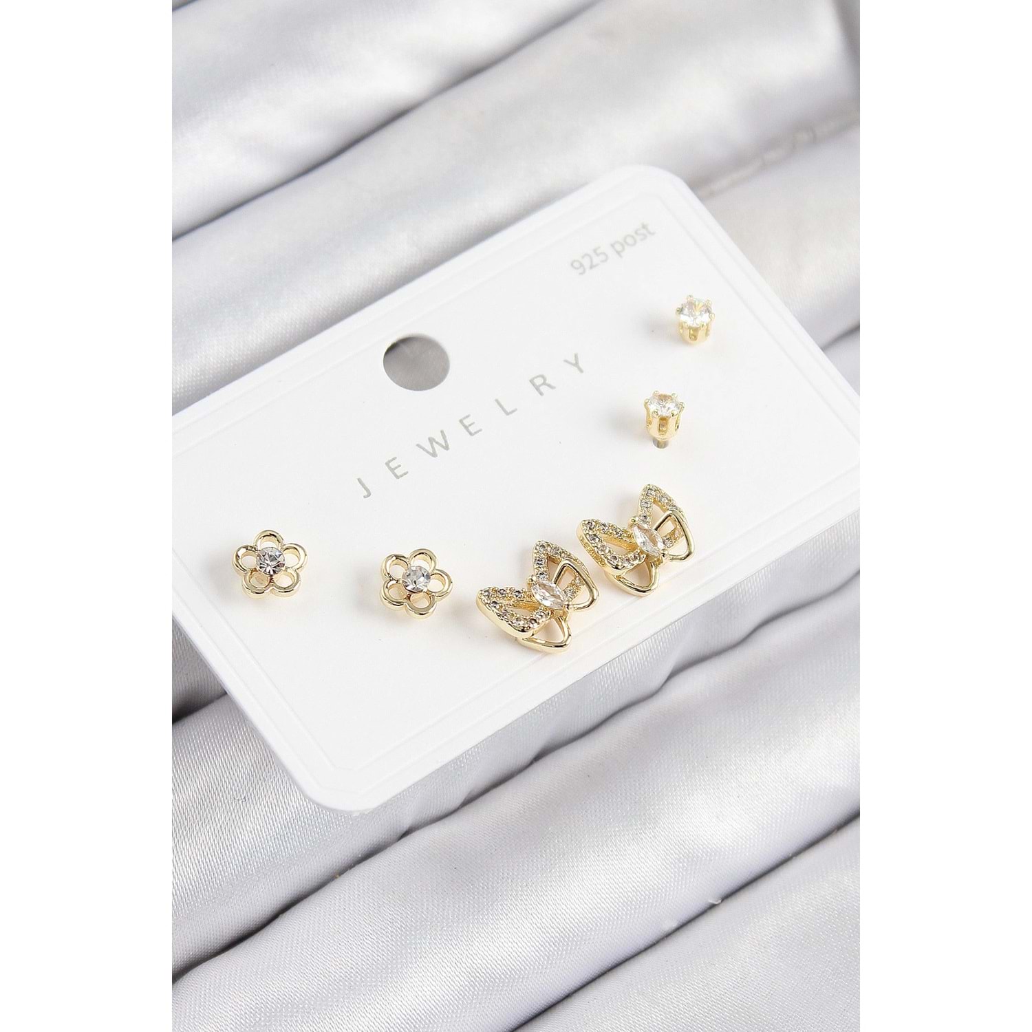 Pirinç Zirkon Taşlı Kelebek Model Gold Renk 925 Ayar Gümüş Çivi Kadın Küpe Set