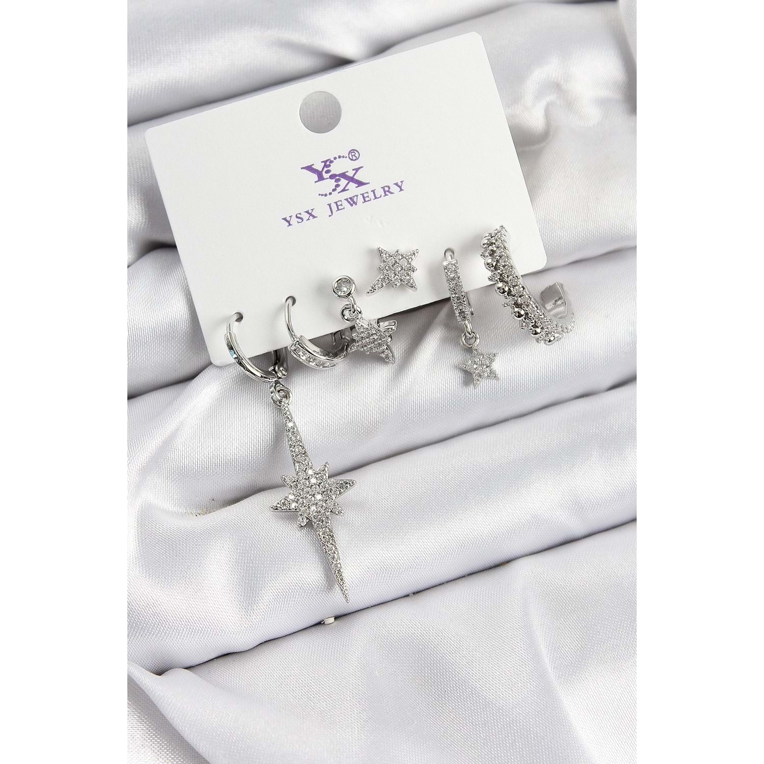 Pirinç Zİrkon Taşlı Kutup Yıldızı Model Gümüş Renk 3'lü Çift Kadın Küpe
