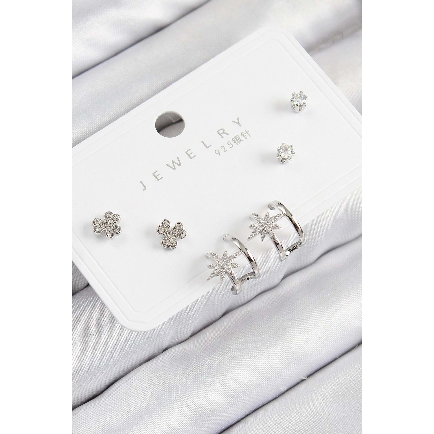 Pirinç Zirkon Taşlı Kutup Yıldızı Model Gümüş Renk 925 Ayar Gümüş Çivi Kadın Küpe Set