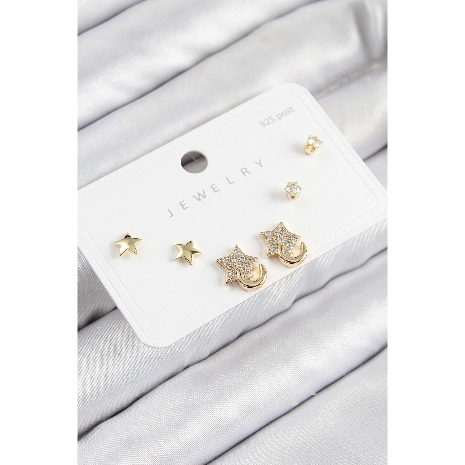 Pirinç Zirkon Taşlı Yıldız Model Gold Renk 925 Ayar Gümüş Çivi Kadın Küpe Set