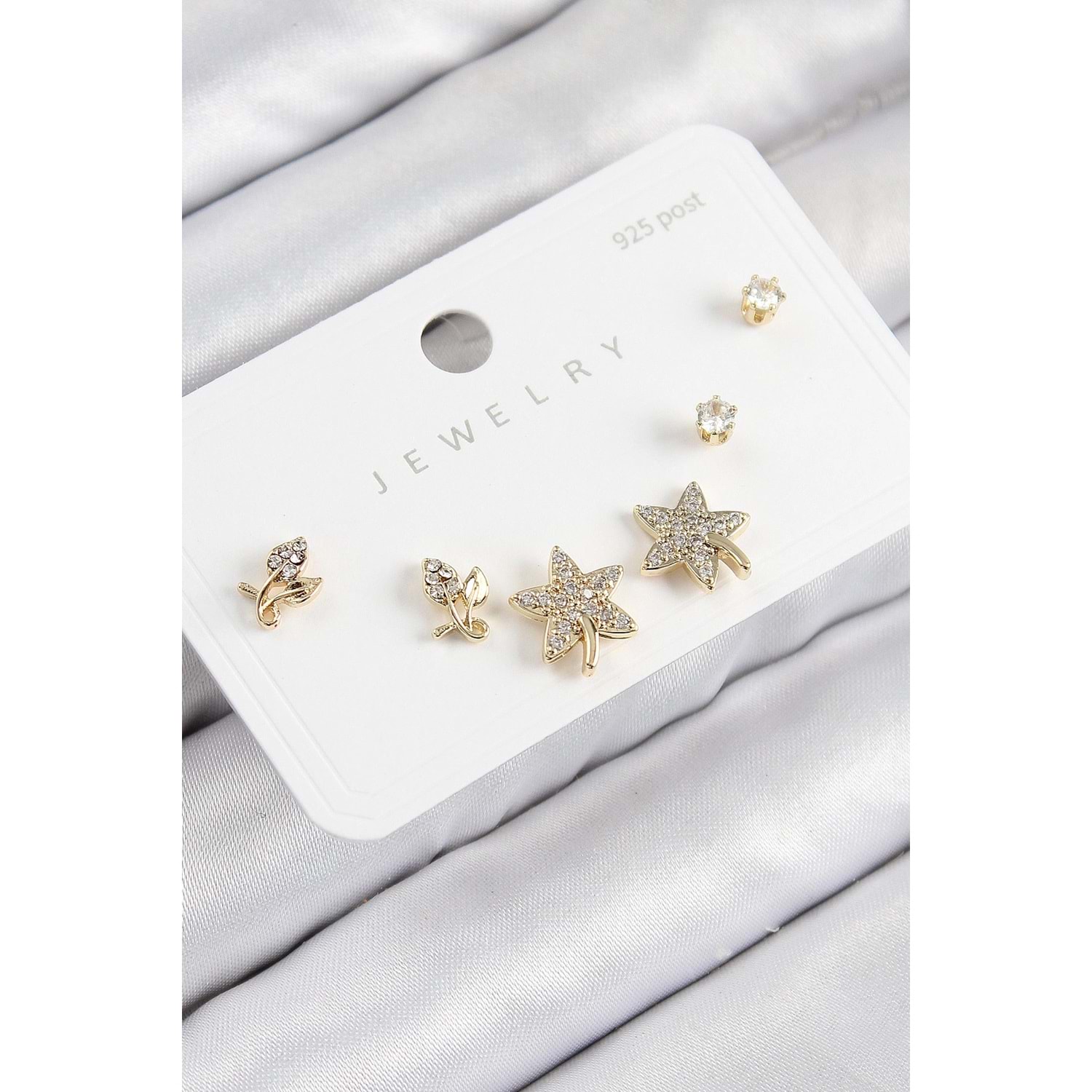 Pirinç Zirkon Taşlı Yıldız Ve Gül Model Gold Renk 925 Ayar Gümüş Çivi Kadın Küpe Set
