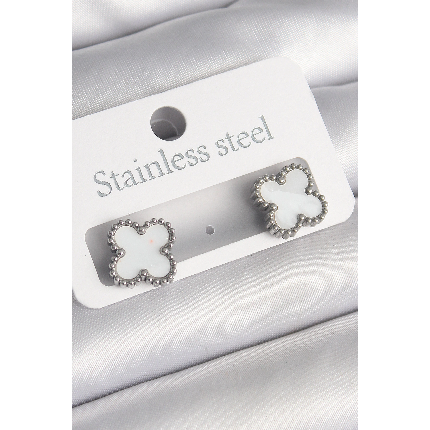 316L Çelik Gümüş Renk Beyaz Yonca Model Kadın Küpe