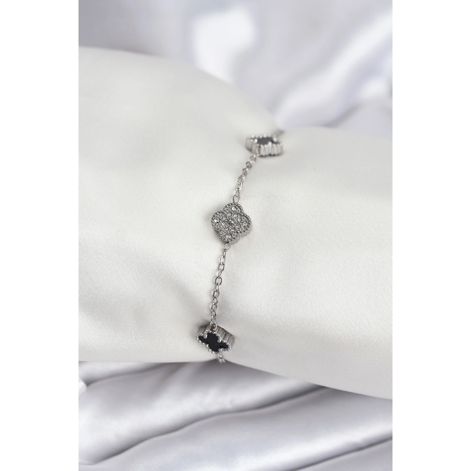 316L Çelik Gümüş Renk Siyah ve Zirkon Taşlı Baby Boy Yonca Kadın Bileklik
