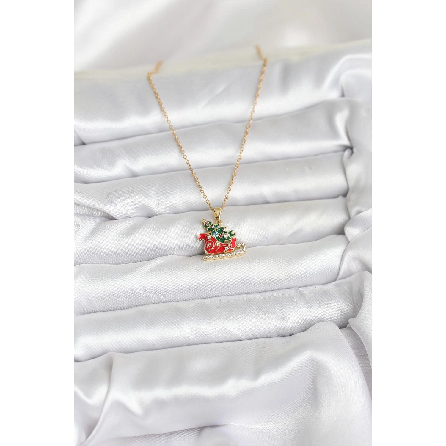 316L Çelik Zincir Gold Renk Kızak ve Çam Ağacı Figürlü Yılbaşı Temalı Kadın Kolye
