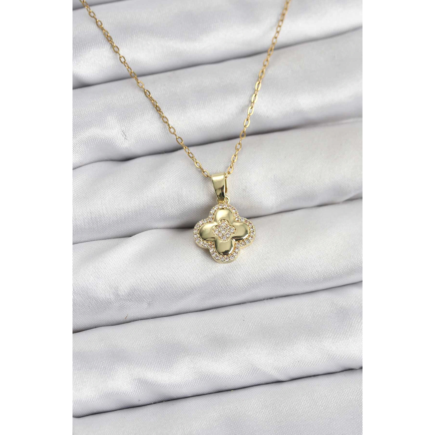 316L Çelik Zincir Gold Renk Zirkon Taşlı Yonca Model Kadın Kolye
