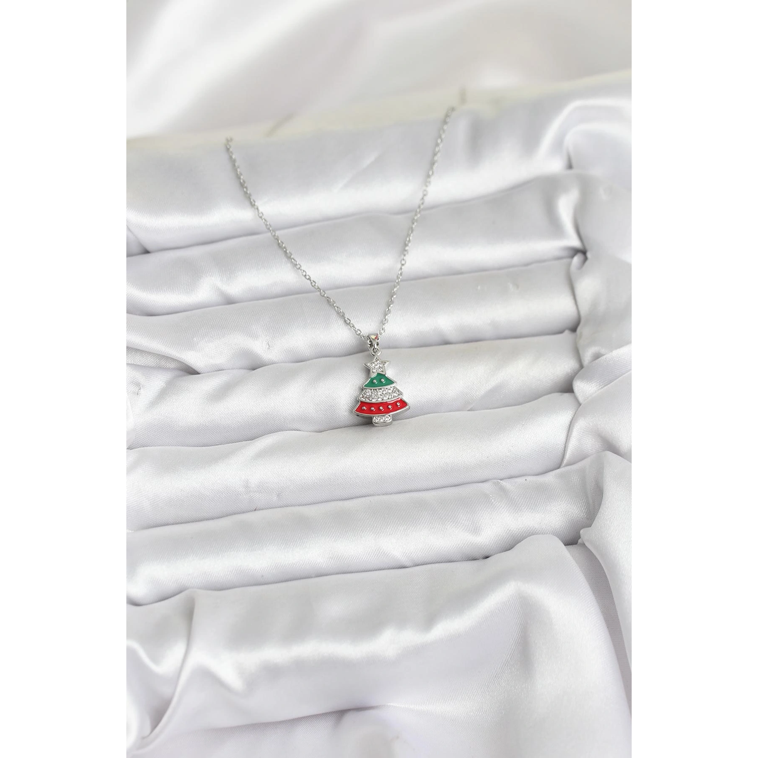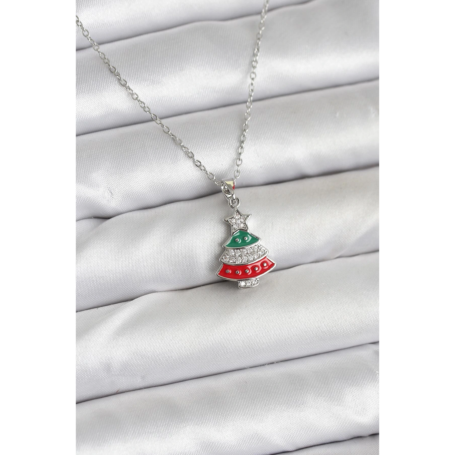 316L Çelik Zincir Gümüş Ren Çam Ağacı Model Zirkon Taşlı Yılbaşı Temalı Kadın Kolye