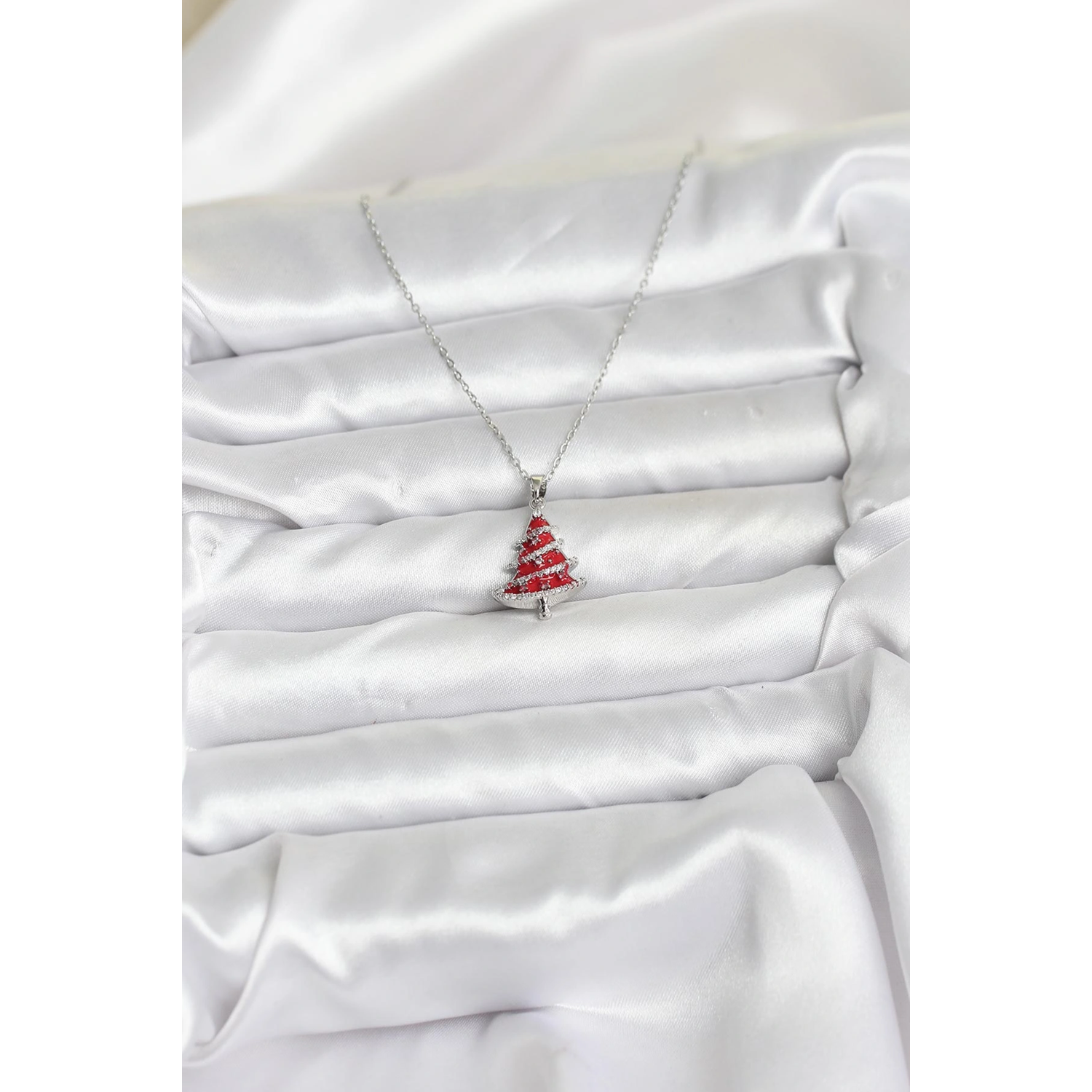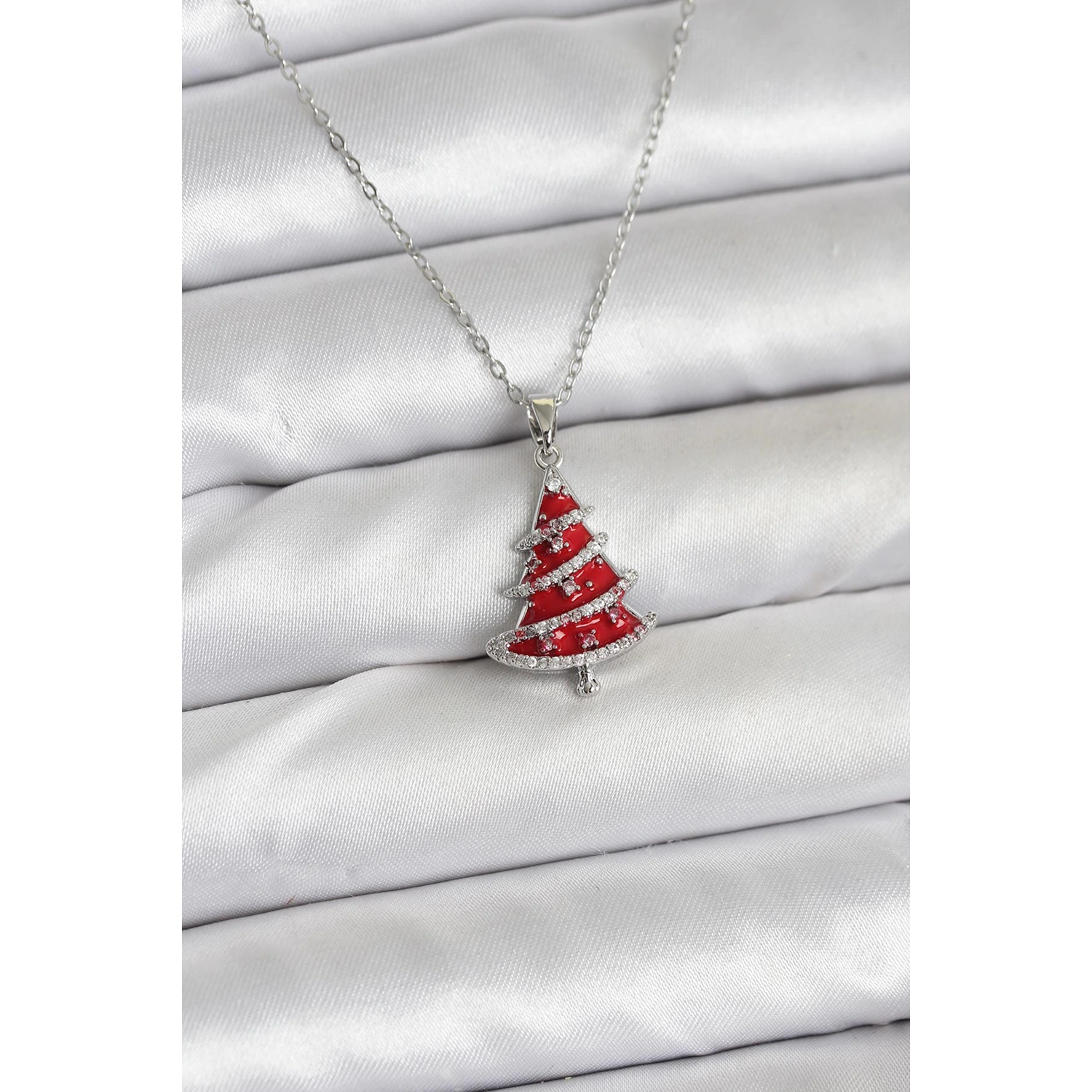 316L Çelik Zincir Gümüş Renk Kırmızı Çam Ağacı Model Yılbaşı Temalı Kadın Kolye