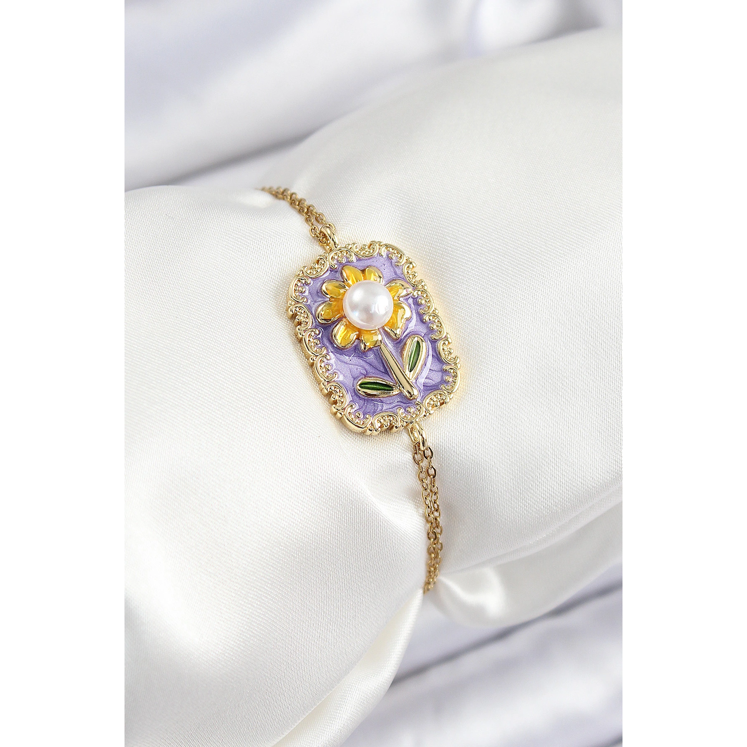 316L Çelik Zincir Mor Mineli Sanatsal Portre İnci Detaylı Papatya Model Gold Renk Kadın Bileklik