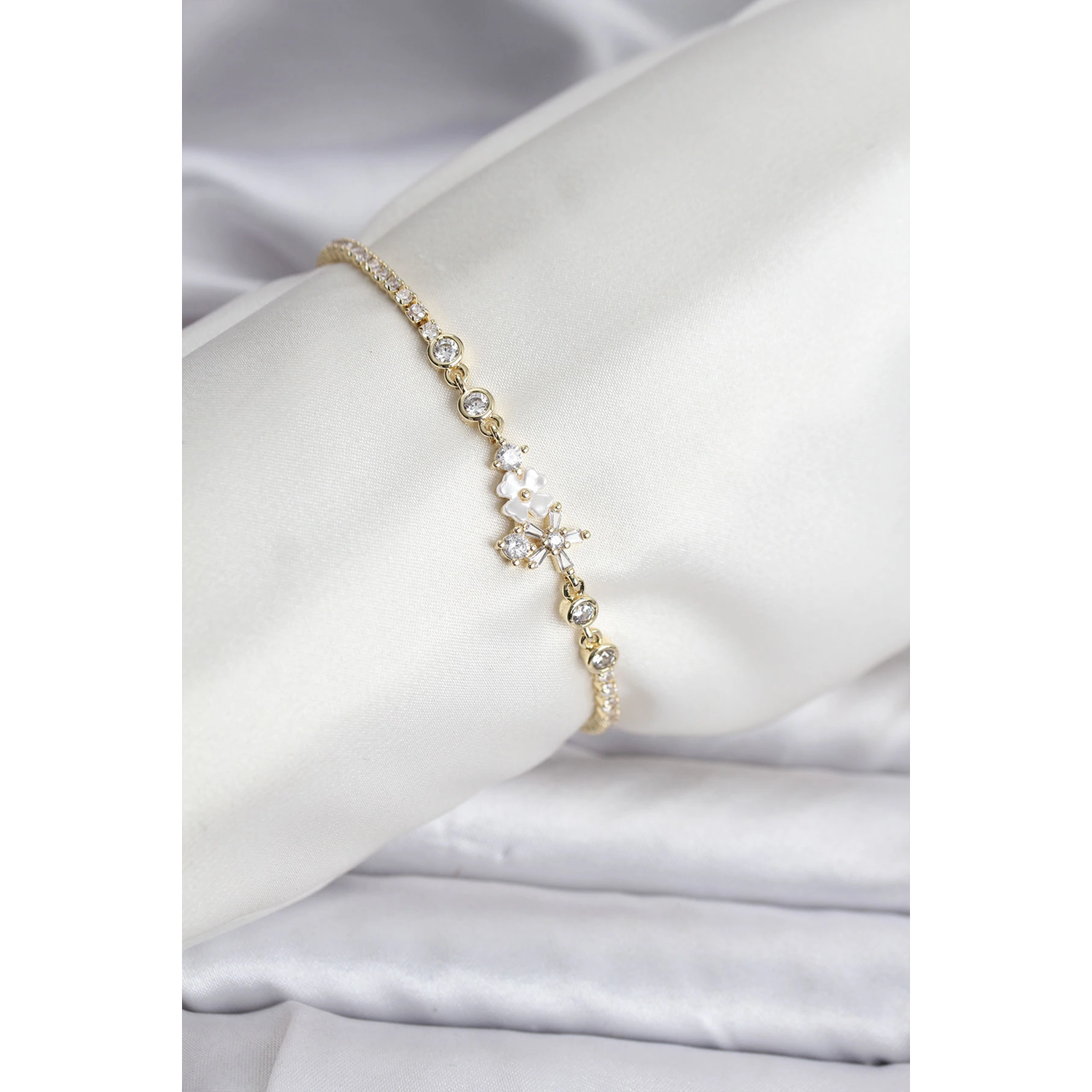 Çiçekli Model Zirkon Taşlı Gold Renk Su Yolu Kadın Bileklik