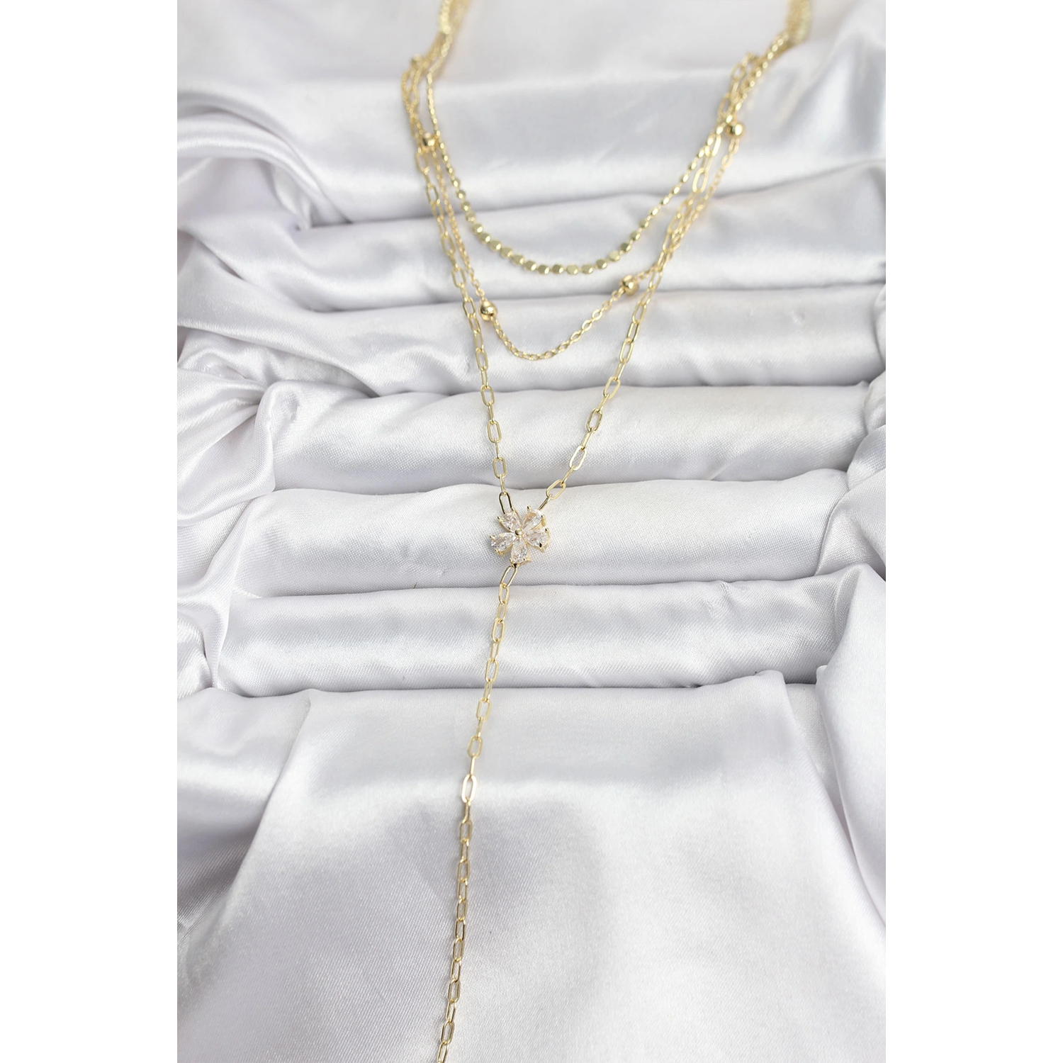 Pirinç Gold Renk Zirkon Taşlı Çiçek Model Detaylı 3'lü Kombin Y Kadın Kolye