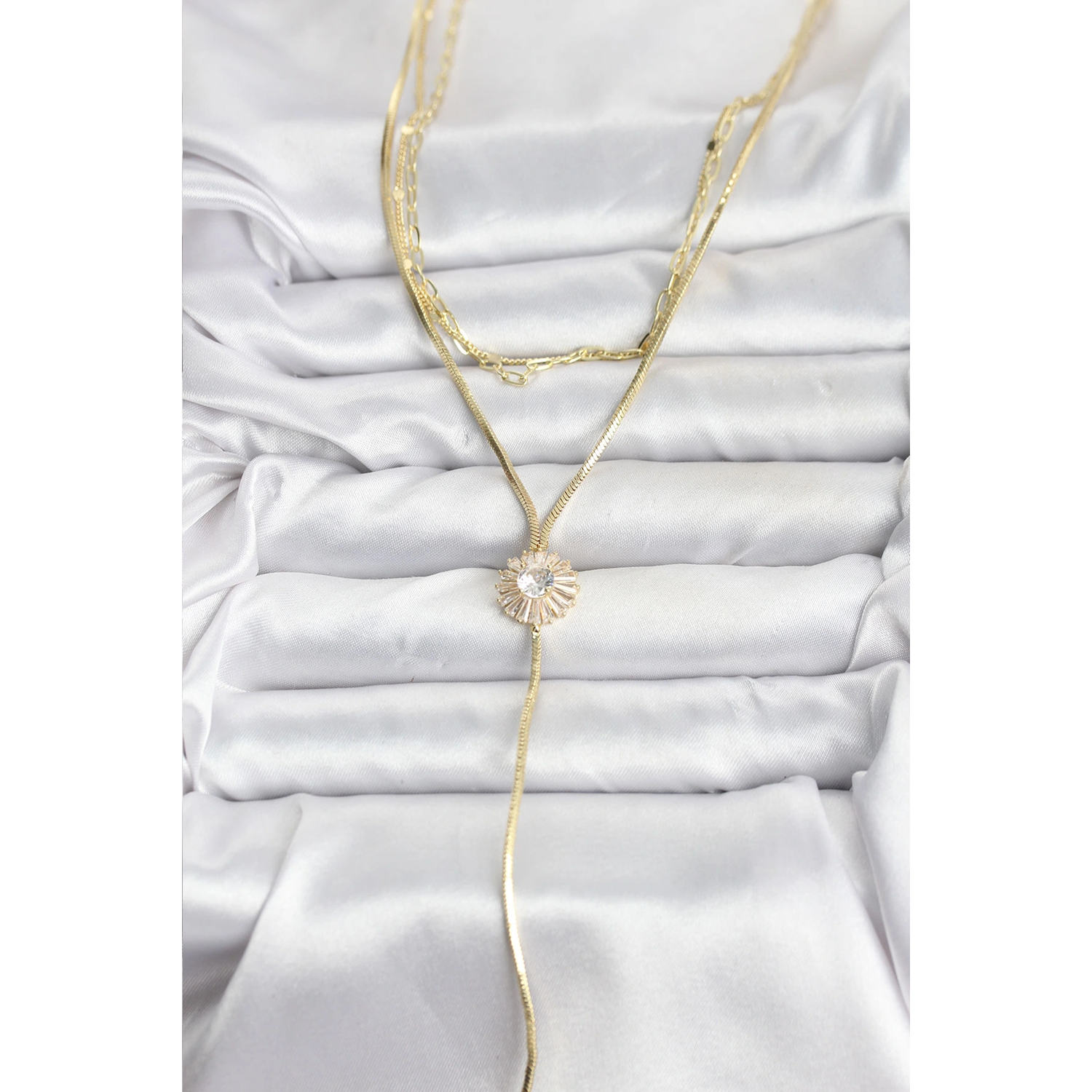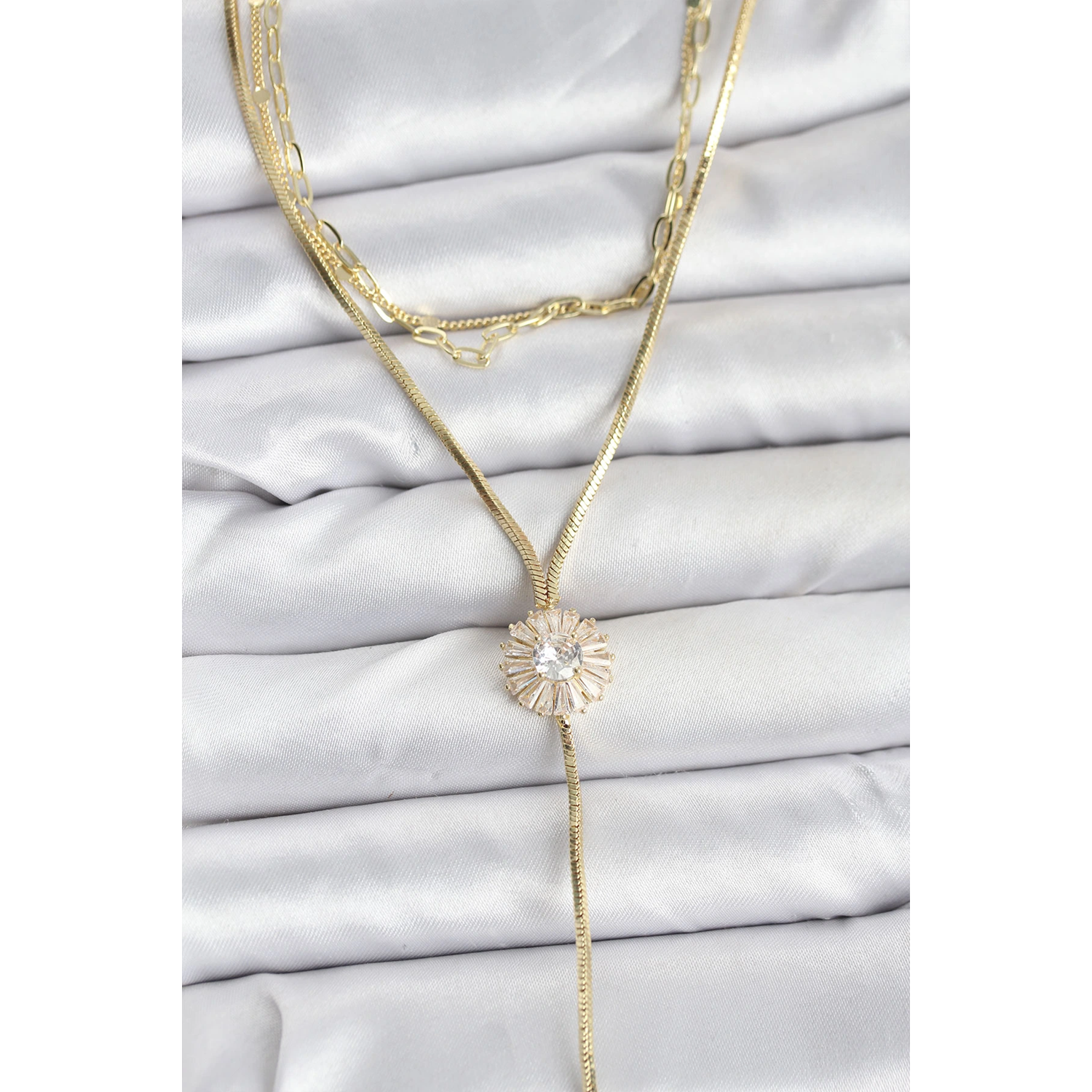 Pirinç Gold Renk Zirkon Taşlı Papatya Model Detaylı 3'lü Kombin Y Kadın Kolye