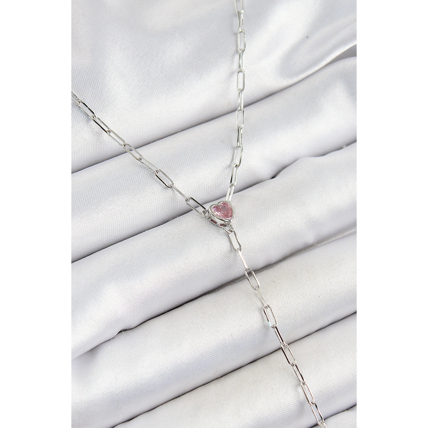 Pirinç Zirkon Taşlı Pembe Kalp Figürlü Y Model Gümüş Renk Kadın Kolye