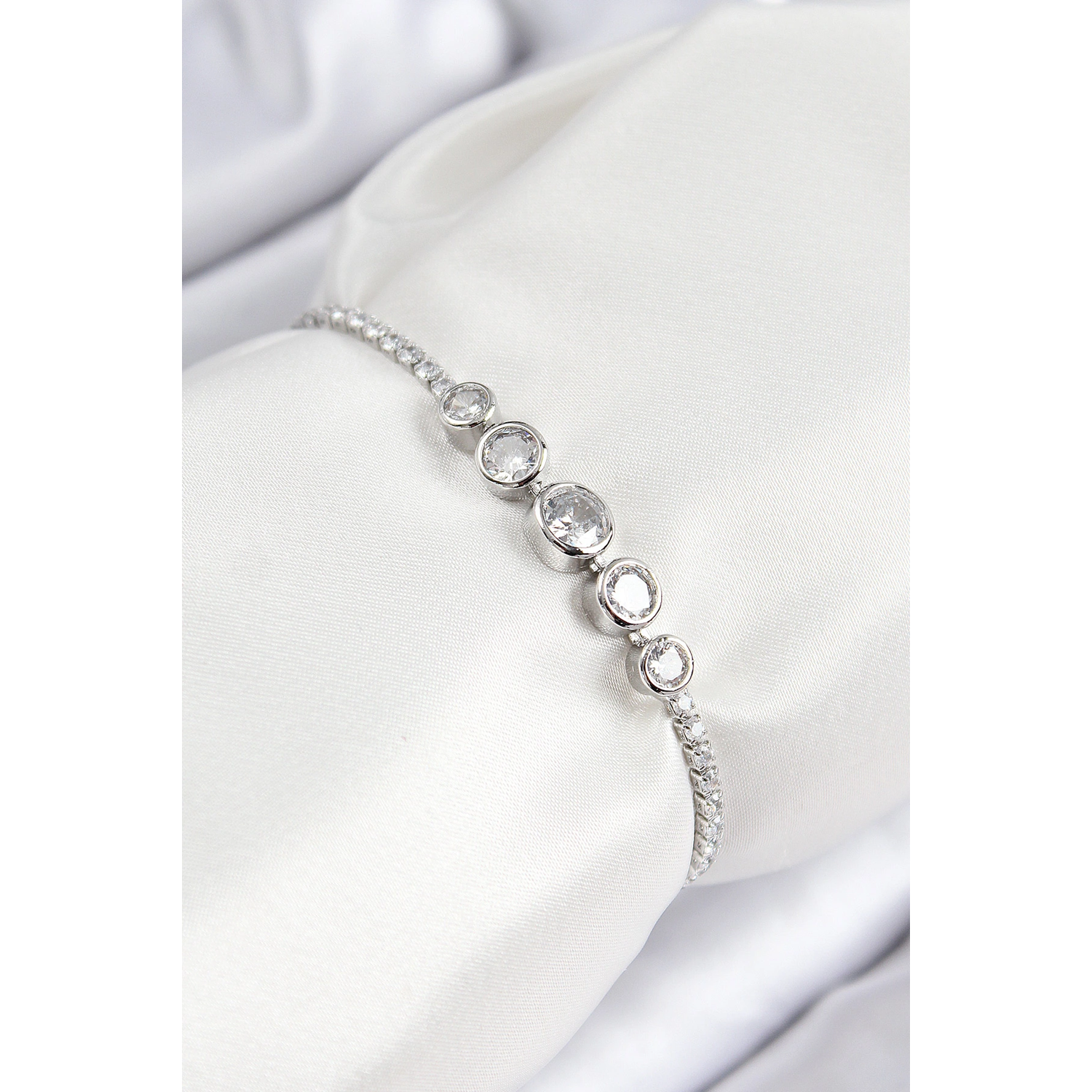 Pirinç Zirkon Taşlı Sıralı Daire Model Gümüş Renk Asansörlü Kadın Bileklik