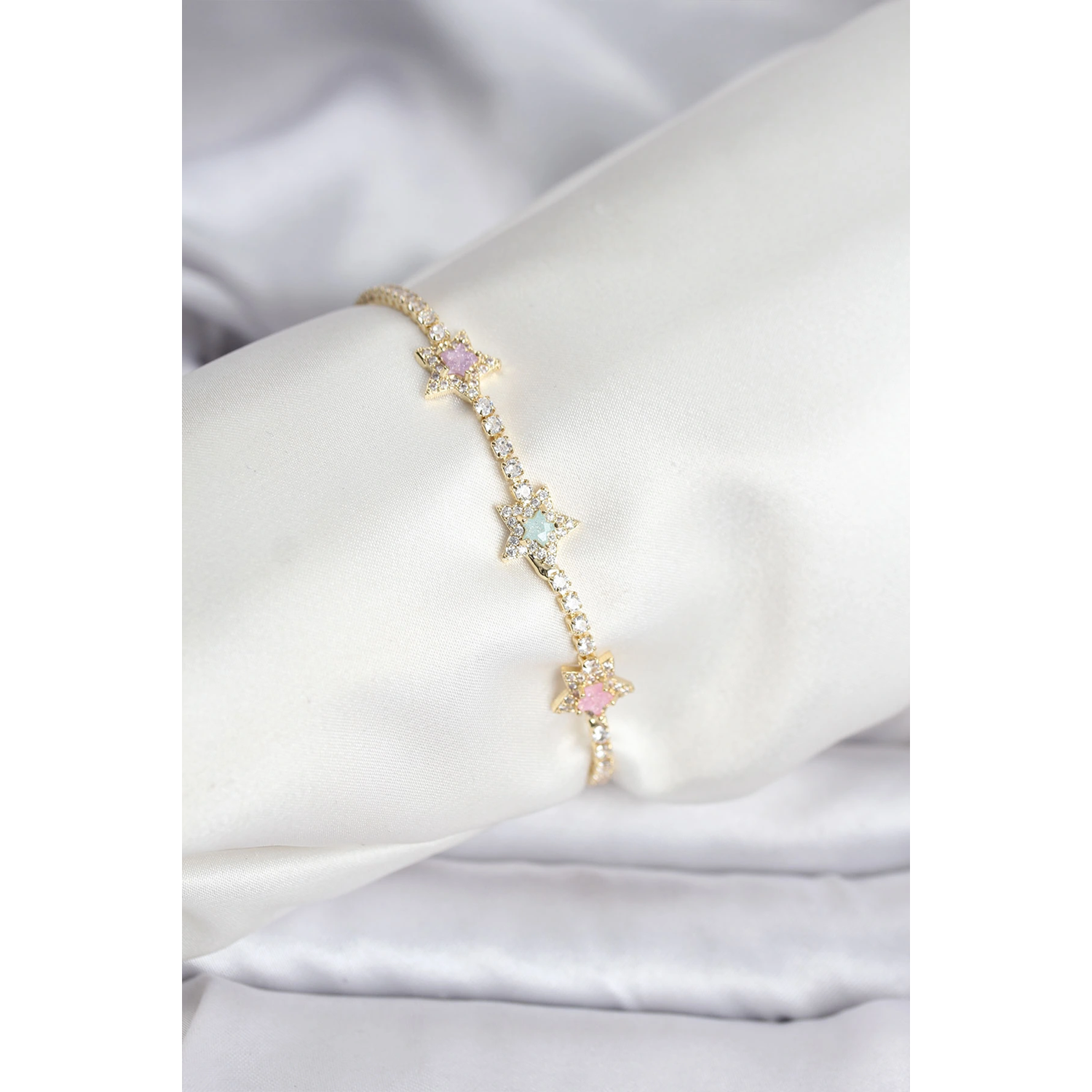 Renkli Yıldız Model Zirkon Taşlı Gold Renk Pirinç Su Yolu Kadın Bileklik