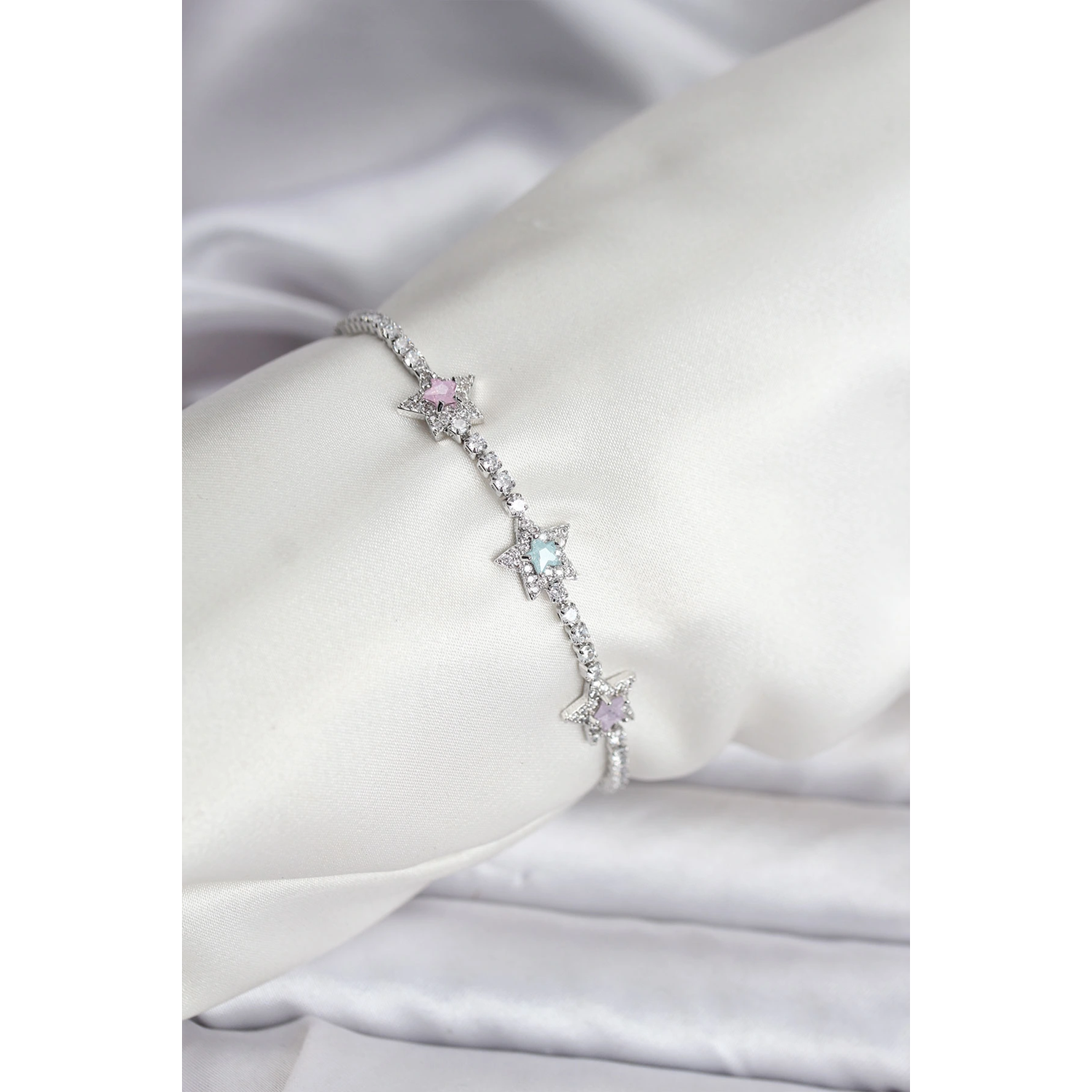 Renkli Yıldız Model Zirkon Taşlı Gümüş Renk Pirinç Su Yolu Kadın Bileklik