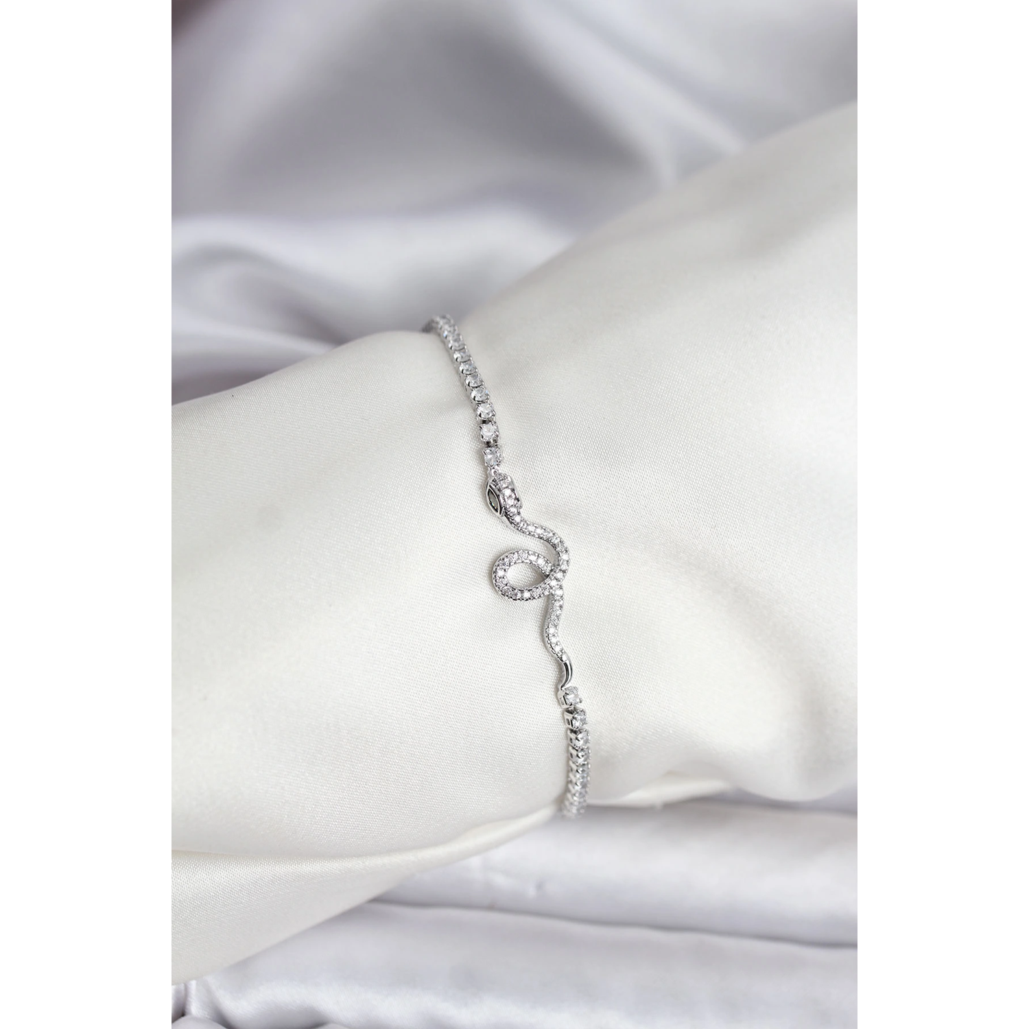 Yılan Model Zirkon Taşlı Gümüş Renk Pirinç Su Yolu Kadın Bileklik