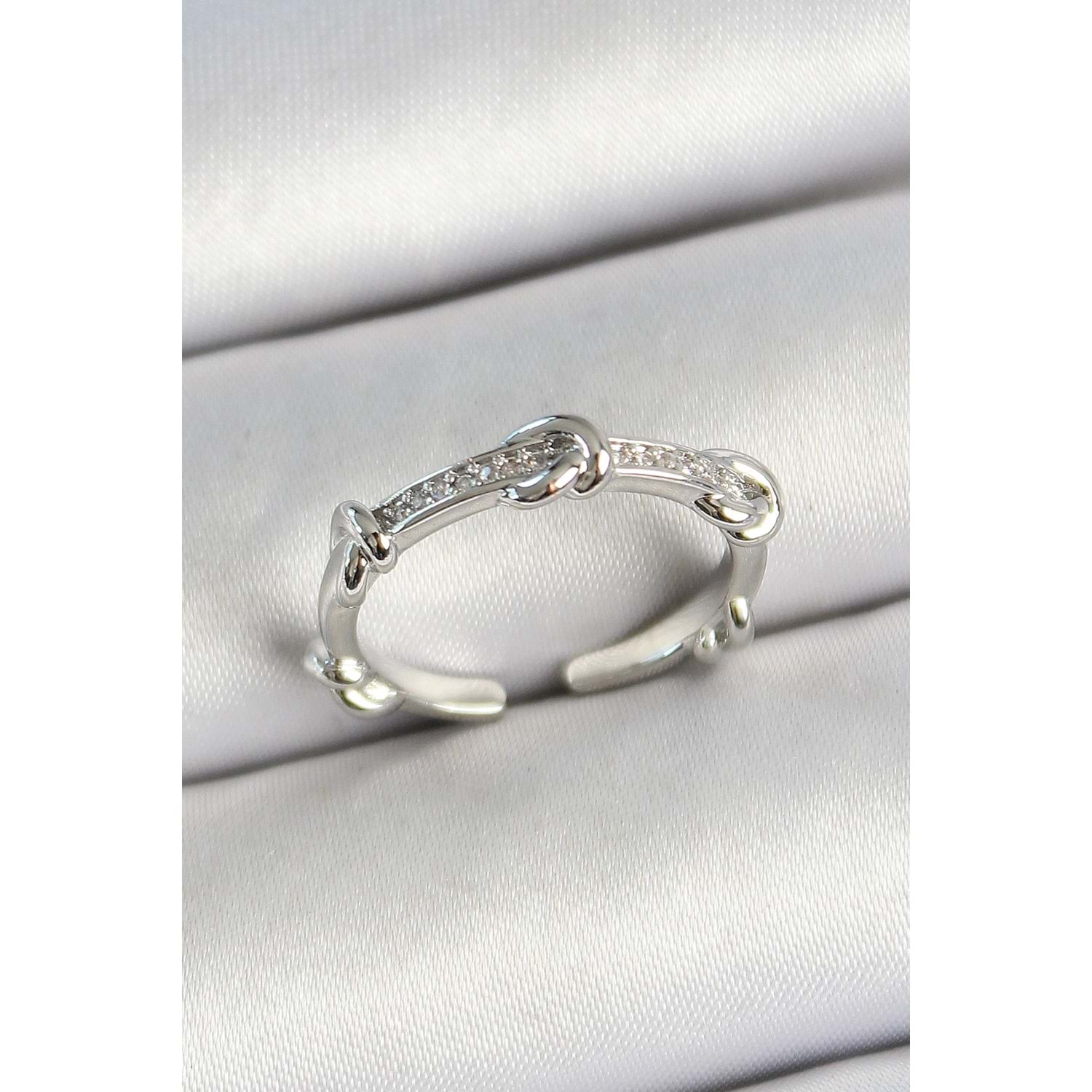 Pirinç Düğüm Figürlü Zirkon Taşlı Gümüş Renk Ayarlanabilir Kadın Yüzük