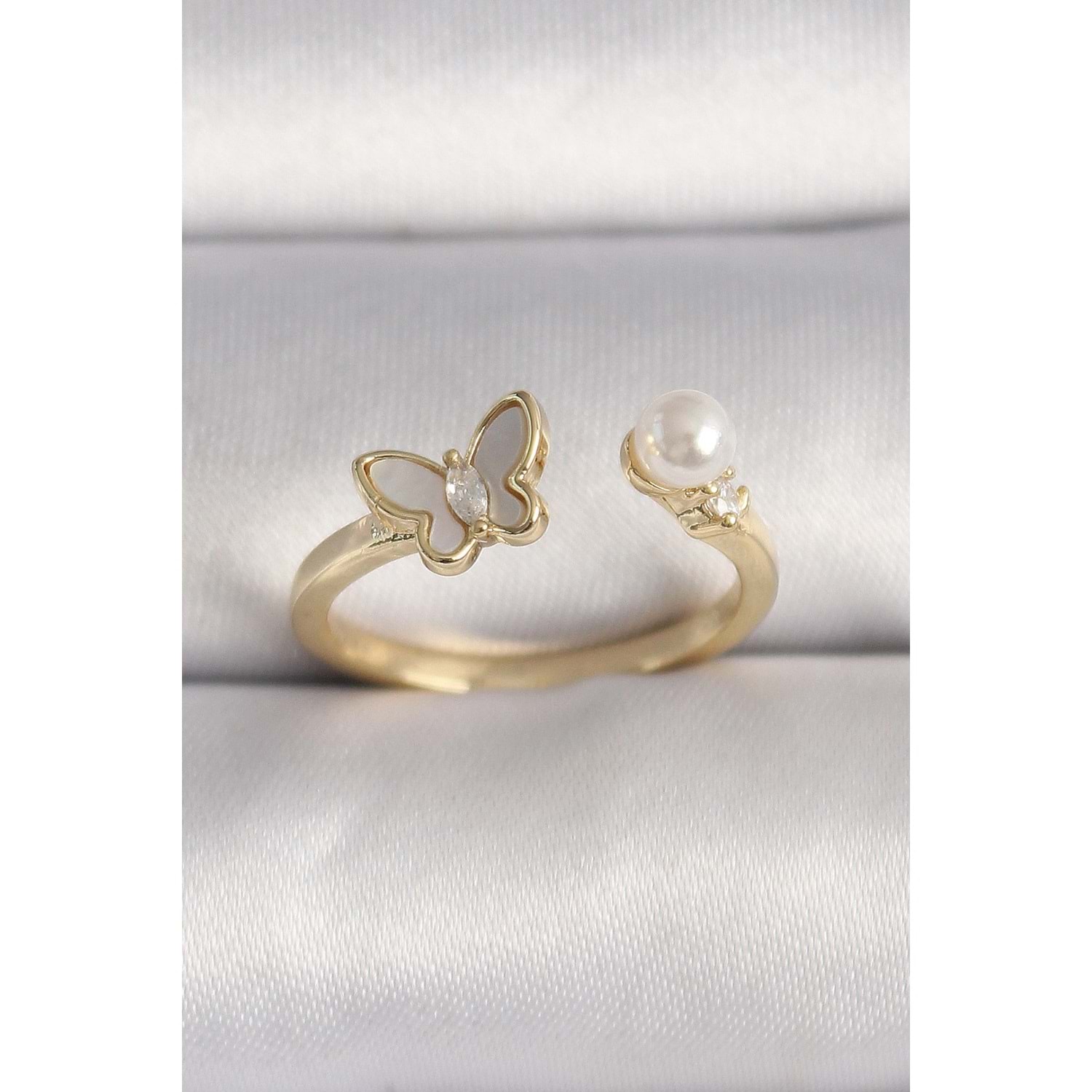 Pirinç Gold Renk Zirkon Taş Detaylı Beyaz Mineli Kelebek Model İnci Detay Ayarlanabilir Yüzük