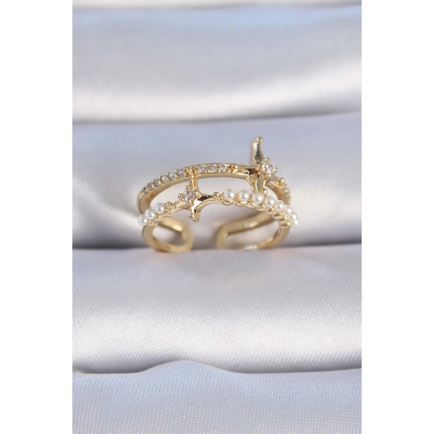 Pirinç Gold Renk Zirkon Taşlı İnci Detay Kutup Yıldızı Model Kadın Yüzük