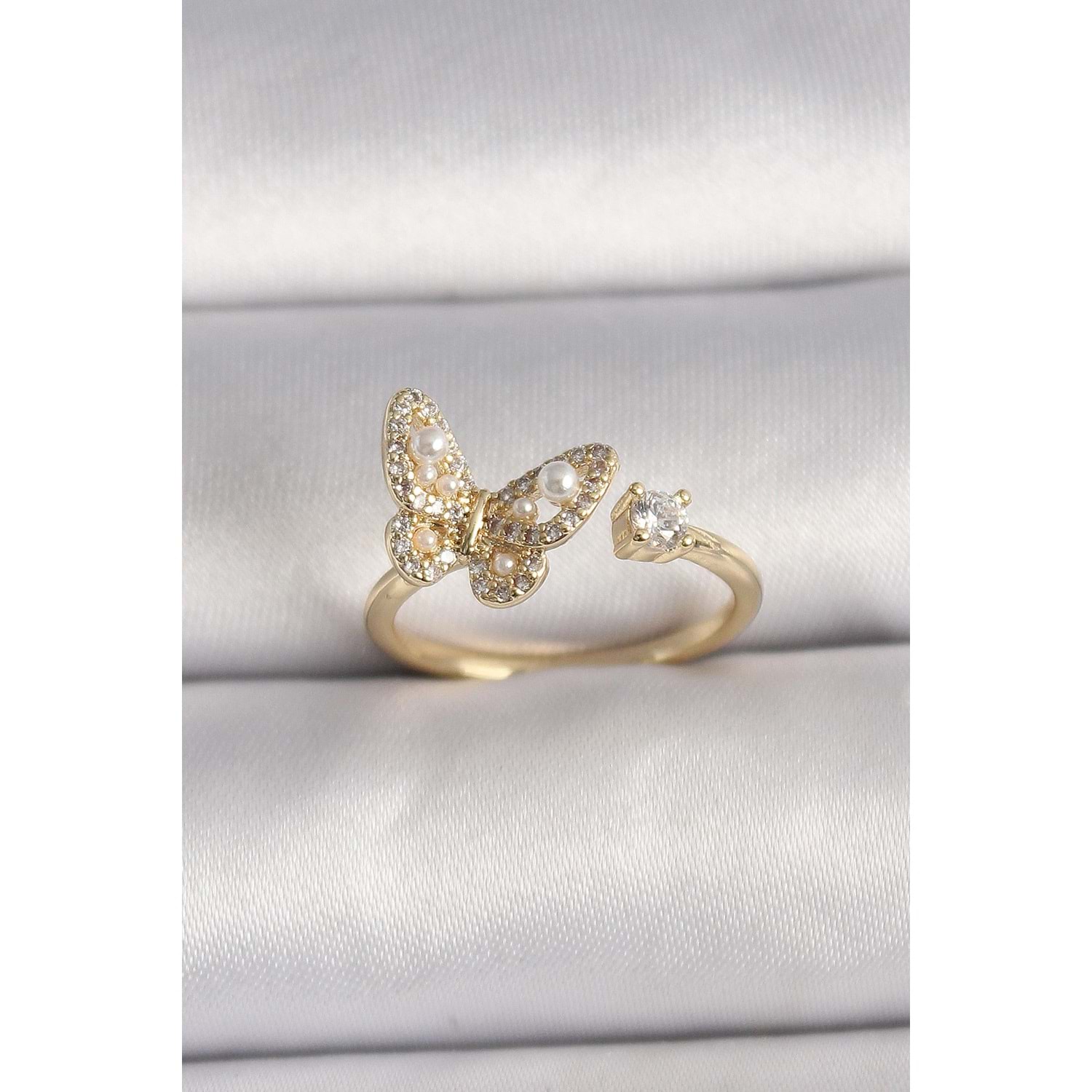 Pirinç Gold Renk Zirkon Taşlı Kelebek Model İnci Detay Ayarlanabilir Yüzük