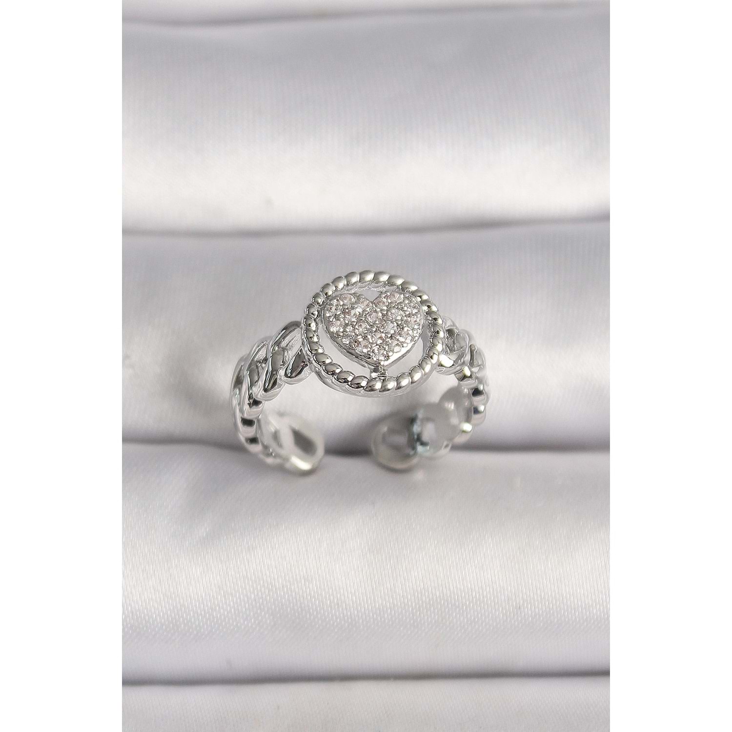 Pirinç Gümüş Renk Zincir Model Zirkon Taşlı Kalp Model Kadın Yüzük