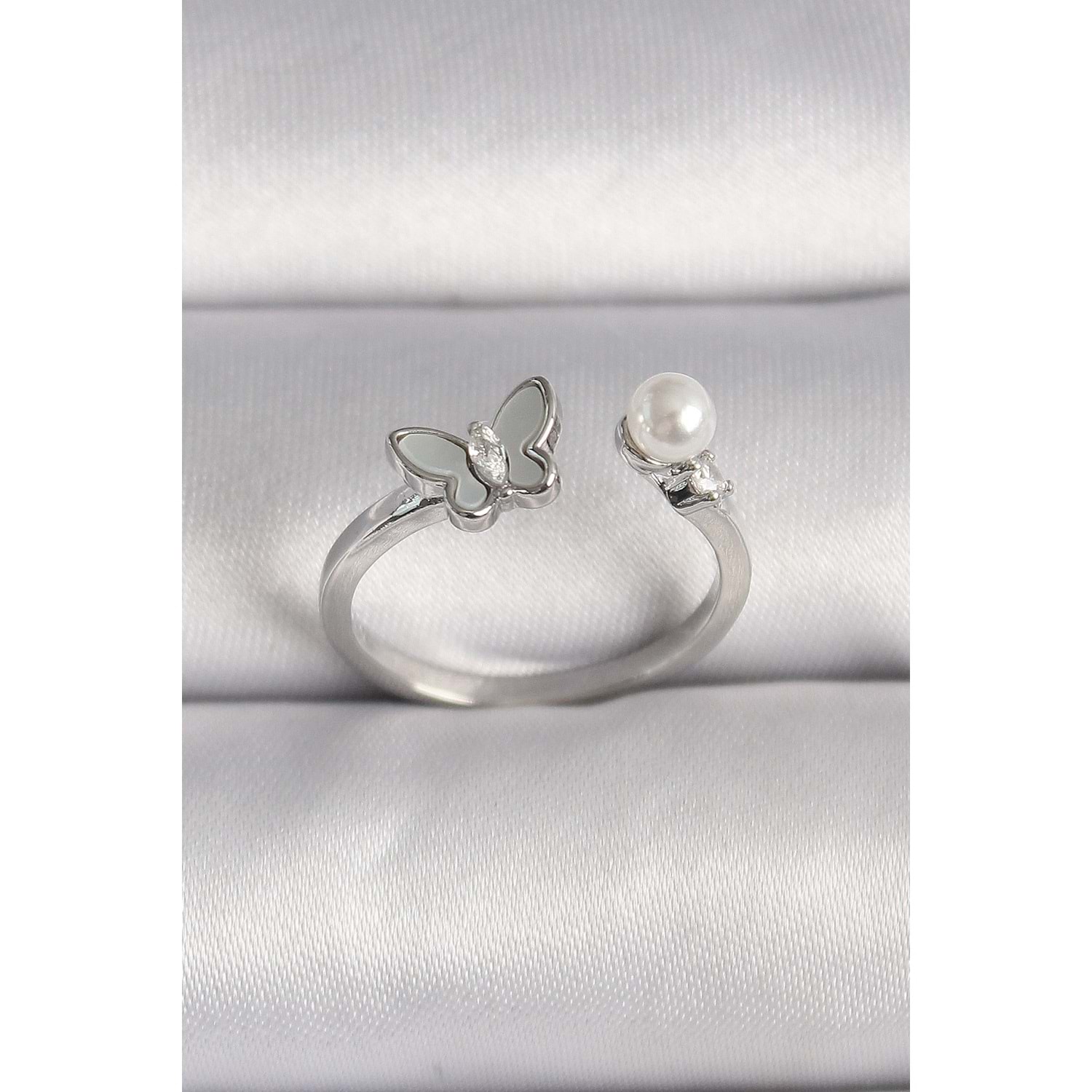 Pirinç Gümüş Renk Zirkon Taş Detaylı Beyaz Mineli Kelebek Figür İnci Detay Ayarlanabilir Yüzük