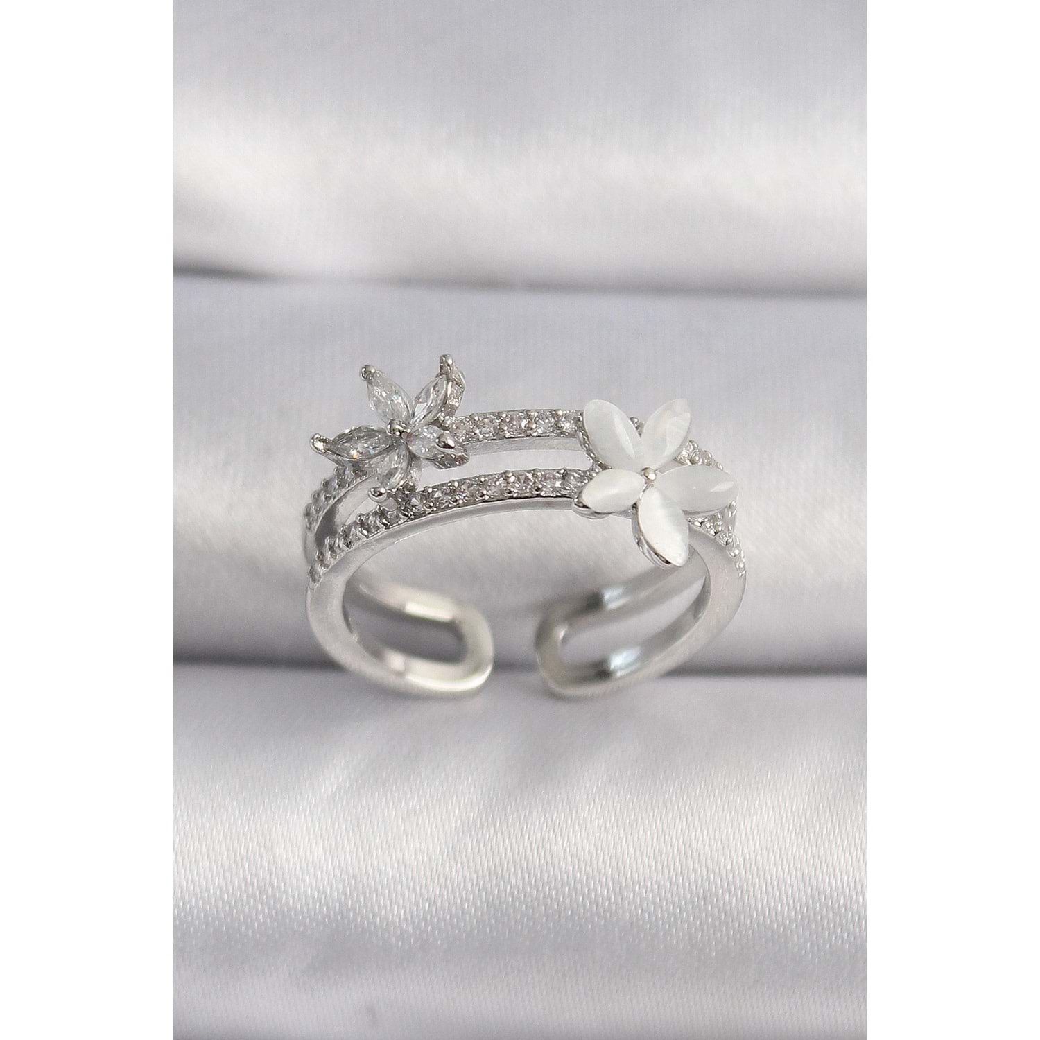 Pirinç Gümüş Renk Zirkon Taşlı Çiçek Model VIP Seri Kadın Yüzük
